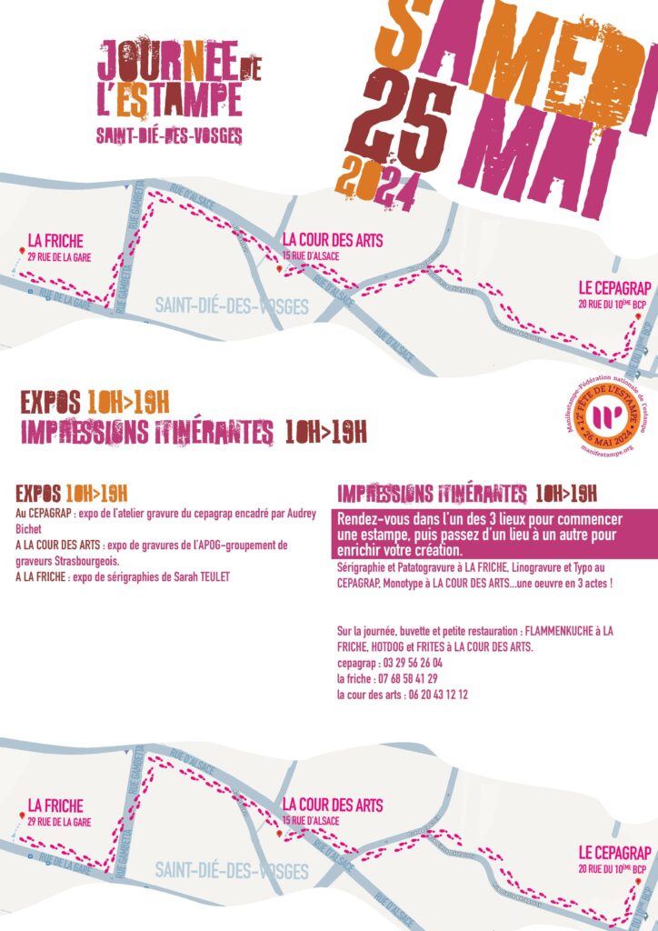 De 10h à 19h samedi, le public est invité à se rendre soit au CEPAGRAP (20 rue du 10e BCP), soit à la Cour des Arts (15 rue d’Alsace) ou soit à la Friche (29 rue de la Gare), afin de réaliser la première touche d’une estampe sur une grande feuille blanche remise sur place. Cette création sera ensuite enrichie dans les 2 autres lieux avec d’autres techniques, propres à chaque endroit.