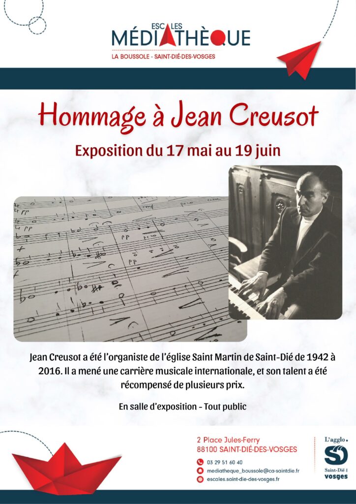 Du 17 mai au 19 juin, la salle d’exposition de La Boussole accueille une exposition rendant hommage à Jean Creusot, qui fut organiste de l’église Saint-Martin de 1942 à 2016. Soit pendant plus de 70 ans. Ami de Olivier Messiaen et Pierre Boulez, Jean Creusot a été tout à la fois compositeur, musicologue, conférencier, enseignant et chef d’orchestre. Sa carrière musicale est internationale et son talent a été récompensé de plusieurs prix. Entrée libre.