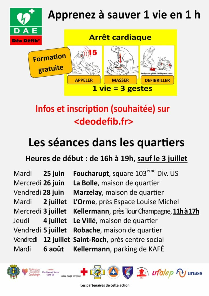 Si vous même et vos proches ne faites pas partie des 503 Déodatiens ayant appris à porter secours à une personne en arrêt cardiaque durant la première semaine de juin, vous pourrez le faire lors de la quarantaine de séances programmées du 25 juin au 6 août sur 9 sites de la ville (voir document ci-dessus). Pour cela, il vous est conseillé de vous inscrire en cliquant ici.