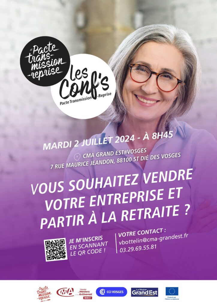 La Chambre des Métiers et de l’Artisanat Grand Est – CMA GE – des Vosges et la Chambre de Commerce et d’Industrie – CCI – des Vosges organisent une conférence à Saint-Dié-des-Vosges, intitulée « Vendre mon entreprise et partir à la retraite », mardi 2 juillet à 8h45 dans ses locaux du 7 rue Maurice-Jeandeon. Animée par Olivier Salvat, directeur d’AGILEVA, et Denis George, manager à AG2R La Mondiale, cette conférence gratuite s’adresse aux dirigeants qui souhaitent vendre leur entreprise. Cliquer ici pour s’inscrire.