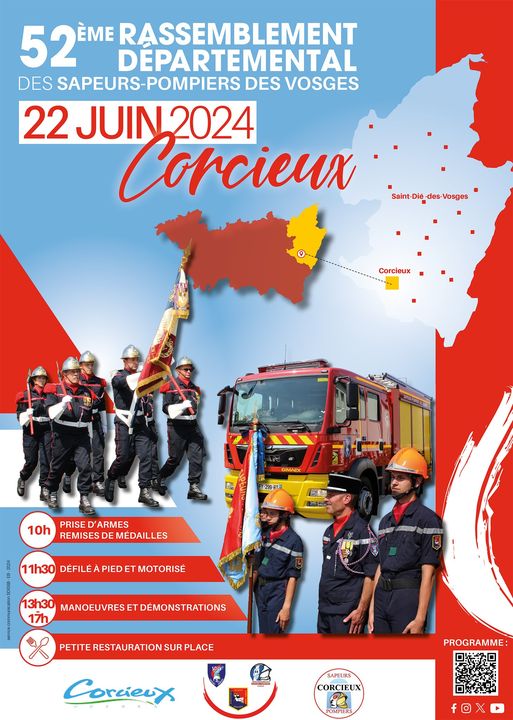 Samedi 22 juin, la commune de Corcieux accueillera le 52e rassemblement départemental des sapeurs-pompiers des Vosges. La journée débutera à 10h, avec la prise d’armes et la remise de médailles, pour se poursuivre par un défilé à pied et motorisé à 11h30, puis par des manoeuvres et démonstrations, de 13h30 à 17h. Petite restauration sur place.