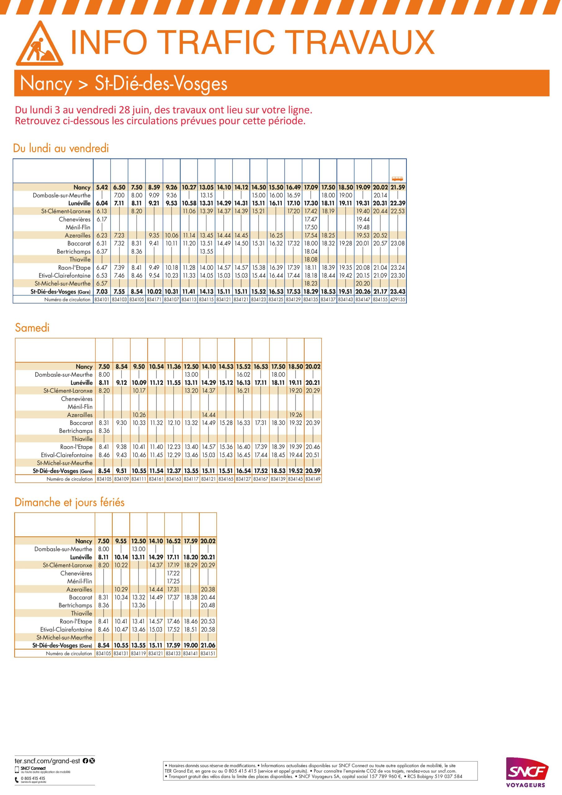 Depuis ce lundi 3 juin et jusqu’au vendredi 28 juin, la SNCF va procéder à des travaux sur la ligne ferroviaire Saint-Dié-des-Vosges – Nancy. En conséquence, certains trains sont supprimés. Ils sont remplacés par des cars. Ci-dessous les circulations prévues durant la durée des travaux (cliquer pour agrandir les images) :