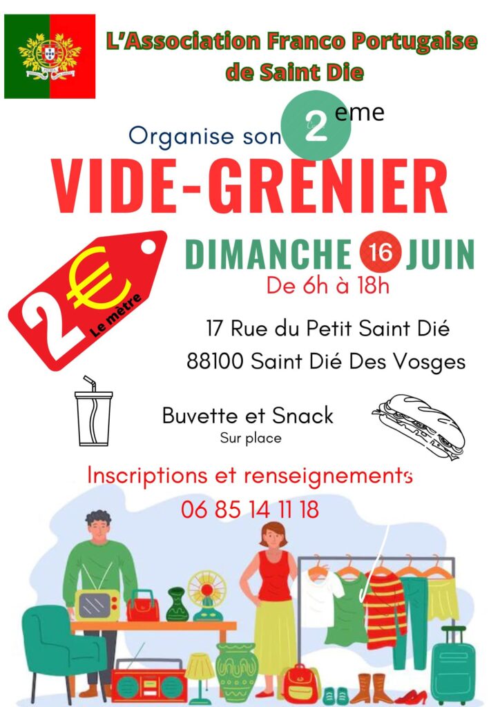 L’association Franco-Portugaise de Saint-Dié-des-Vosges organise son deuxième vide-greniers le dimanche 16 juin, de 6h à 18h au 17 rue du Petit Saint-Dié. Buvette et petite restauration sur place. 2€ le mètre. Inscriptions et renseignements par téléphone, au 06-85-14-11-18.
