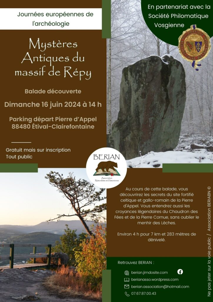 Dans le cadre des Journées européennes de l’archéologie, l’association naturaliste et historienne BERIAN et la Société Philomatique Vosgienne organise une balade découverte des mystères antiques du massif de Répy, ce dimanche 16 juin à 14h.