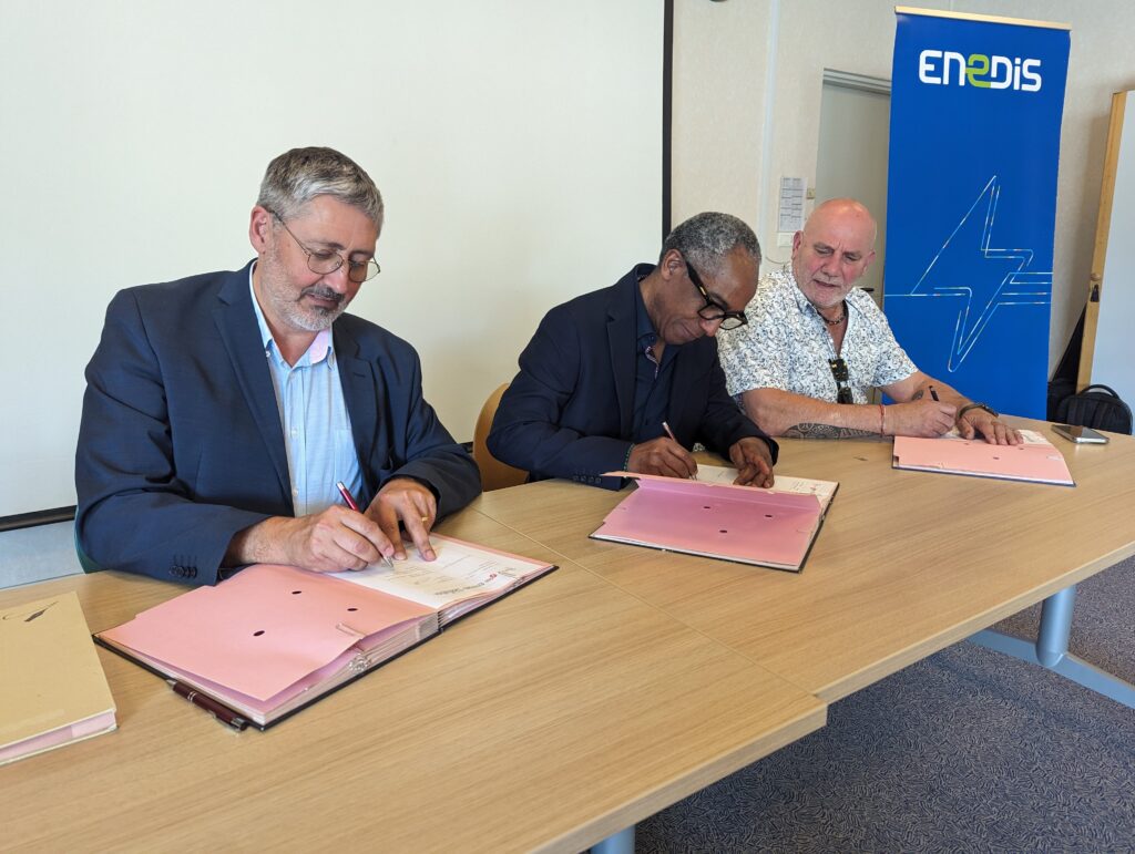 Une convention de partenariat a été signée ce lundi 10 juin en début d’après-midi, entre Enedis, l’entreprise Sotreca et le lycée Georges-Baumont. Paraphée par le proviseur Eric Bogeat, André Desirée, directeur territorial Enedis dans les Vosges, et Daniel Mauffrey, dirigeant de Sotreca, cette convention s’inscrit dans le cadre du programme d’actions « Les écoles des réseaux pour la transition énergétique », qui a été lancé en mars 2023.