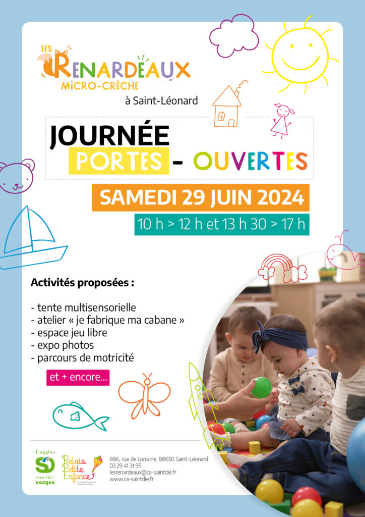 Au programme de ces portes-ouvertes : tente multisensorielle, atelier « je fabrique ma cabane », espace jeu libre, expo de photographies, parcours de motricité… rendez-vous de 10h à 12h, puis de 13h30 à 17h, au 886 rue de Lorraine. Plus de renseignements par téléphone, au 03-29-41-31-95, ou via lesrenardeaux@ca-saintdie.fr.