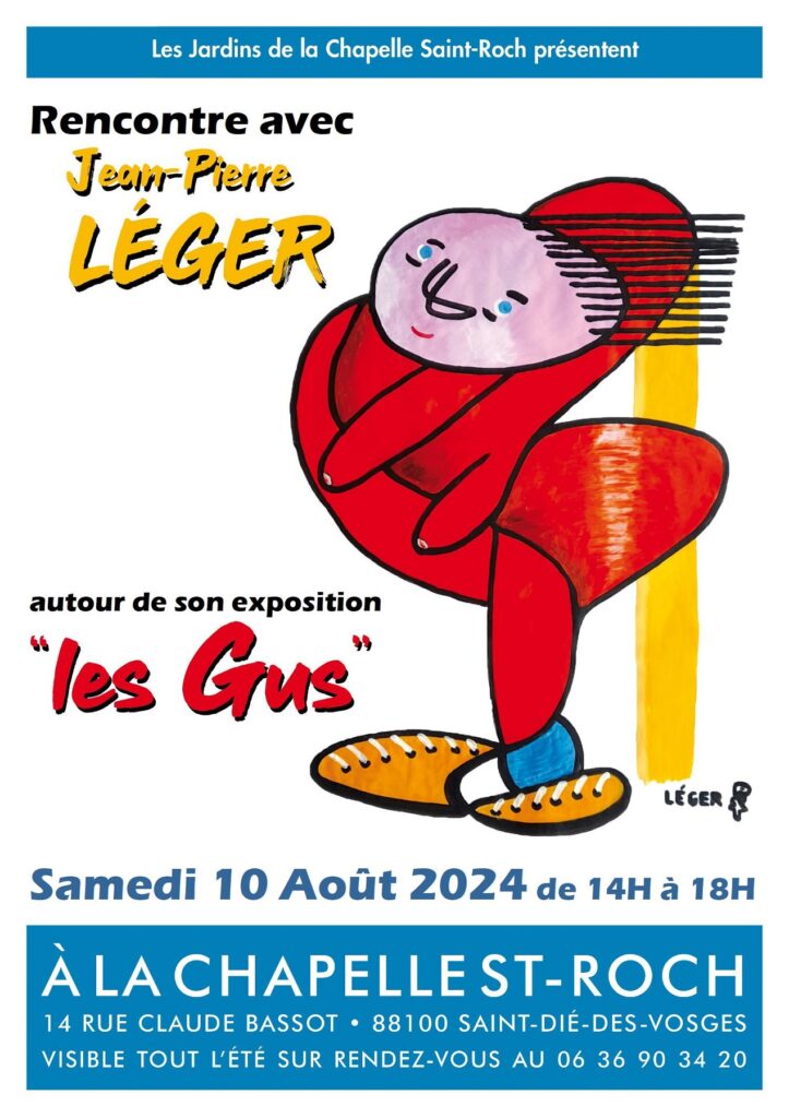 L’artiste Jean-Pierre Léger, bien connu en Déodatie, présente son exposition « Les Gus » tout au long de l’été à la chapelle Saint-Roch. L’exposition est visible sur rendez-vous, par téléphone au 06-36-90-34-20. Samedi 10 août, il sera présent de 14h à 18h pour rencontrer et échanger avec les visiteurs. Entrée libre.