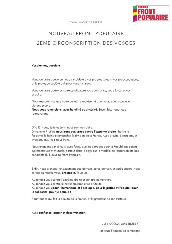 « Nous, Julie et Joris, nous sommes clairs. Dimanche 7 juillet, nous irons aux urnes battre l’extrême droite : battre le fascisme, la haine et empêcher la division de la France. Avec gravité, à reculons, et avec douleur, mais nous irons. »