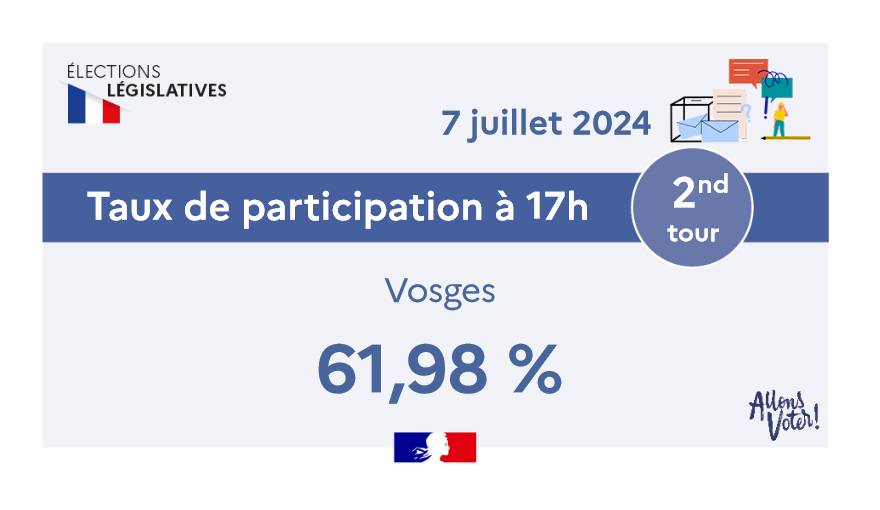 Le taux de participation dans les Vosges au scrutin du deuxième tour des élections législatives anticipées est estimé à 61,98% à 17h. Il était de 60,04% à la même heure dimanche dernier, lors du premier tour, et de 42,54% au deuxième tour des législatives de 2022.