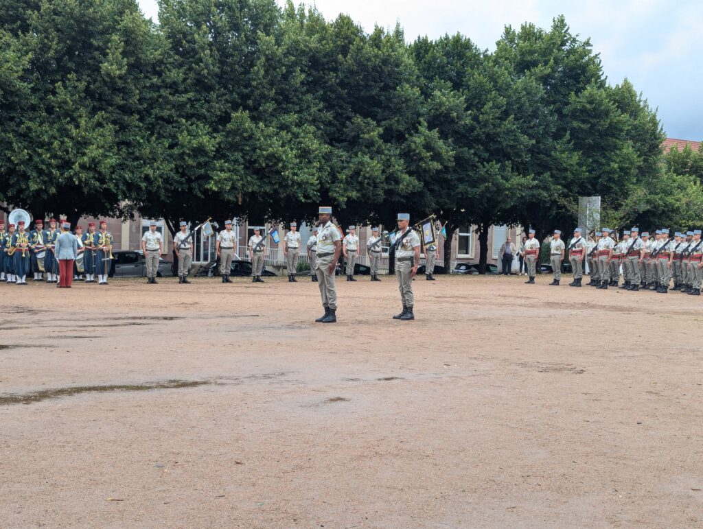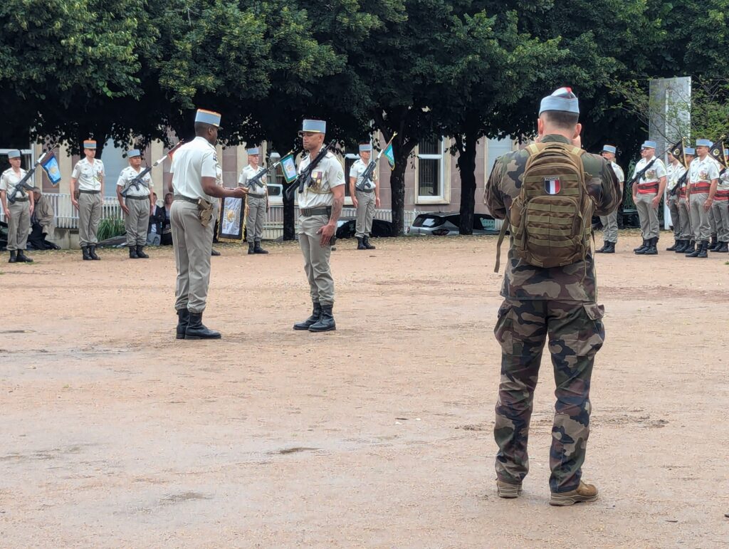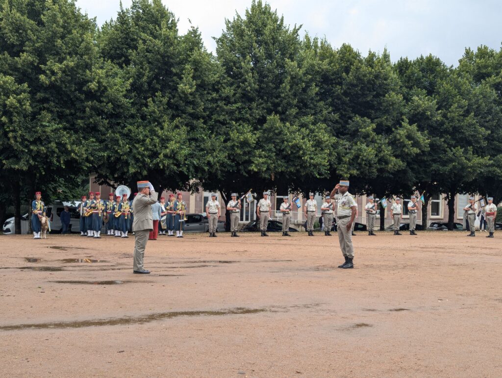 Le capitaine Nicolas Caihol (au premier plan) succède au capitaine Gaël Gélas (en arrière plan aux côtés du colonel Jean Michelin)
