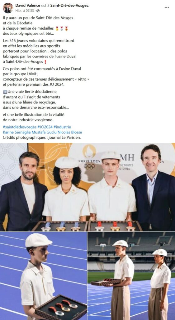 Les polos que porteront les 515 jeunes volontaires qui se chargeront de remettre les médailles aux athlètes sont confectionnés dans la cité déodatienne. Plus précisément à l’usine Duval, conçue par le célébre architecte Le Corbusier et aujourd’hui classée au Patrimoine Mondial de l’UNESCO. Ces polos ont été commandés à l’usine déodatienne par le groupe LVHM, comme le précise l’ancien maire David Valence sur ses réseaux. Le tissu qui compose ces polos a été fabriqué à partir de chutes de jersey de coton, collecté dans les ateliers LVMH et recyclé par la startup Weturn.