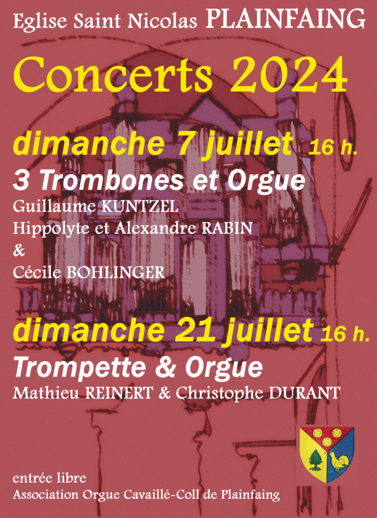 - Dimanche 7 juillet à 16 heures : Guillaume KUNTZEL, Hippolyte et Alexandre RABIN (3 trombonistes), et Cécile MICHEL-BOHLINGER (organiste)