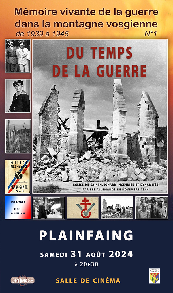 À l’invitation de la commune de Plainfaing, dans le cadre des manifestations pour le 80ème anniversaire des évènements de La Planchette à Fouchifol, Jacques Cuny présentera le samedi 31 août 2024 à 20h30 au Cinéma de Plainfaing son film « Du temps de la guerre » réalisé en 2004.
