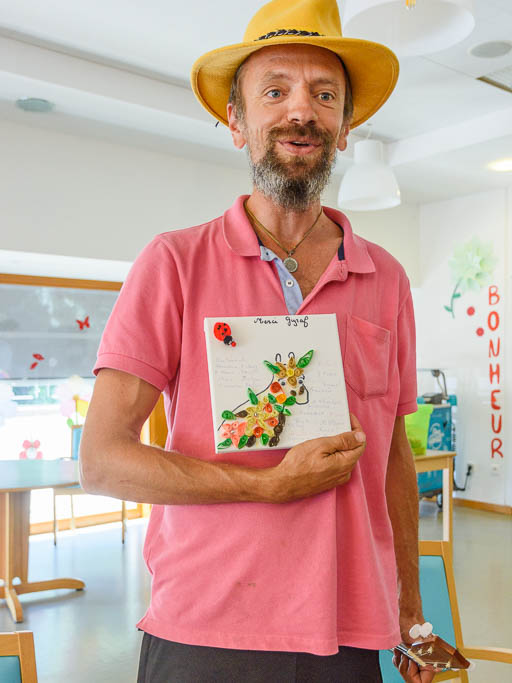 Christophe Chatel dit Giraf artiste de la compagnie des 3 Trésor reçoit un tableau en signe de remerciements.