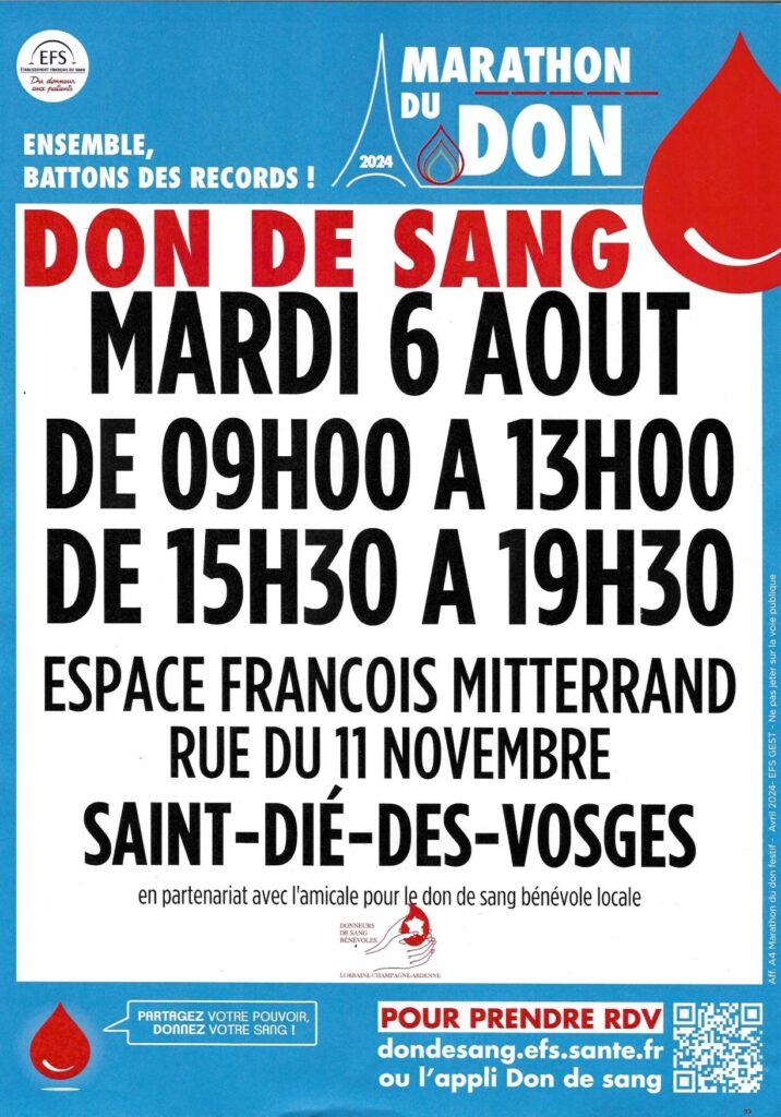 La prochaine collecte de sang organisée à Saint-Dié-des-Vosges par l’Etablissement Français du Sang – EFS – Grand Est, avec le soutien de l’amicale locale des Donneurs de Sang bénévoles, aura lieu demain mardi 6 août, de 9h à 13h puis de 15h30 à 19h30 à l’Espace François-Mitterrand. Pour prendre rendez-vous, facultatif mais conseillé, rendez-vous sur https://dondesang.efs.sante.fr.