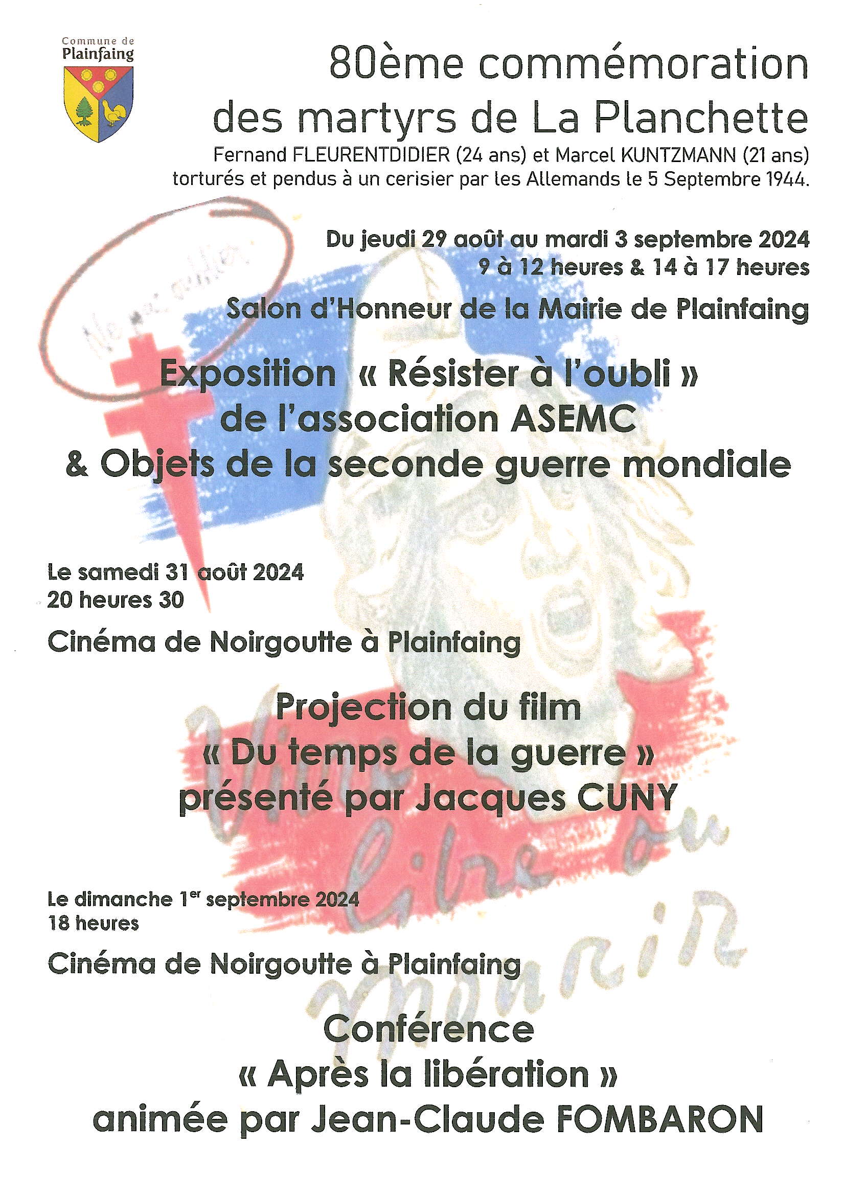C’est pour commémorer le 80e anniversaire de la mort des 2 martyrs de la Planchette que la Commune de Plainfaing organise l’exposition « Résister à l’oubli », une projection du film « Du temps de la guerre » de Jacques Cuny au cinéma de Noirgoutte, et une conférence « Après la Libération » animée par Jean-Claude Fombaron, président de la Société Philomatique Vosgienne.