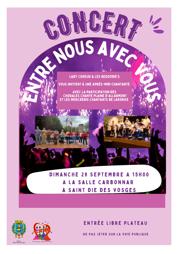 Les chorales déodatiennes Lady’Choeur et Les BeGoodie’s pousseront la voix à la salle Carbonnar dimanche prochain. Soit le 29 septembre. Les chorales Chante Plaine d’Allarmont et Les Mercredis Chantants de Laronxe prendront également part au concert. Entrée libre avec plateau à l’entrée.
