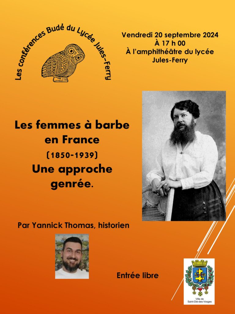La première conférence Budé de la rentrée 2024-2025 se tiendra le vendredi 20 septembre, à partir de 17h à l’amphithéâtre de la Cité Scolaire Jules-Ferry. Cette conférence, intitulée « Les femmes à barbe en France, une approche genrée », sera animée par l’historien Yannick Thomas. Entrée libre. Pour toute informations complémentaire : association.bude88@gmail.com.