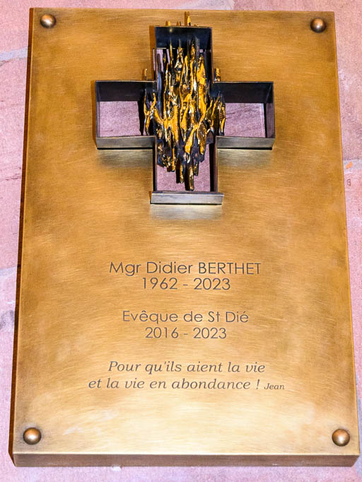 Un hommage lui a été rendu un an après sa disparition, avec le dévoilement d’une plaque située au sein du caveau des évêques de la cathédrale de Saint-Dié-des-Vosges. La plaque, sur laquelle est gravée la devise de Mgr Berthet, « Pour qu’ils aient la vie, et la vie en abondance » (Jean 10.10), a été dévoilée hier jeudi en fin de journée après une messe officiée par les prêtres du Diocèse déodatien.