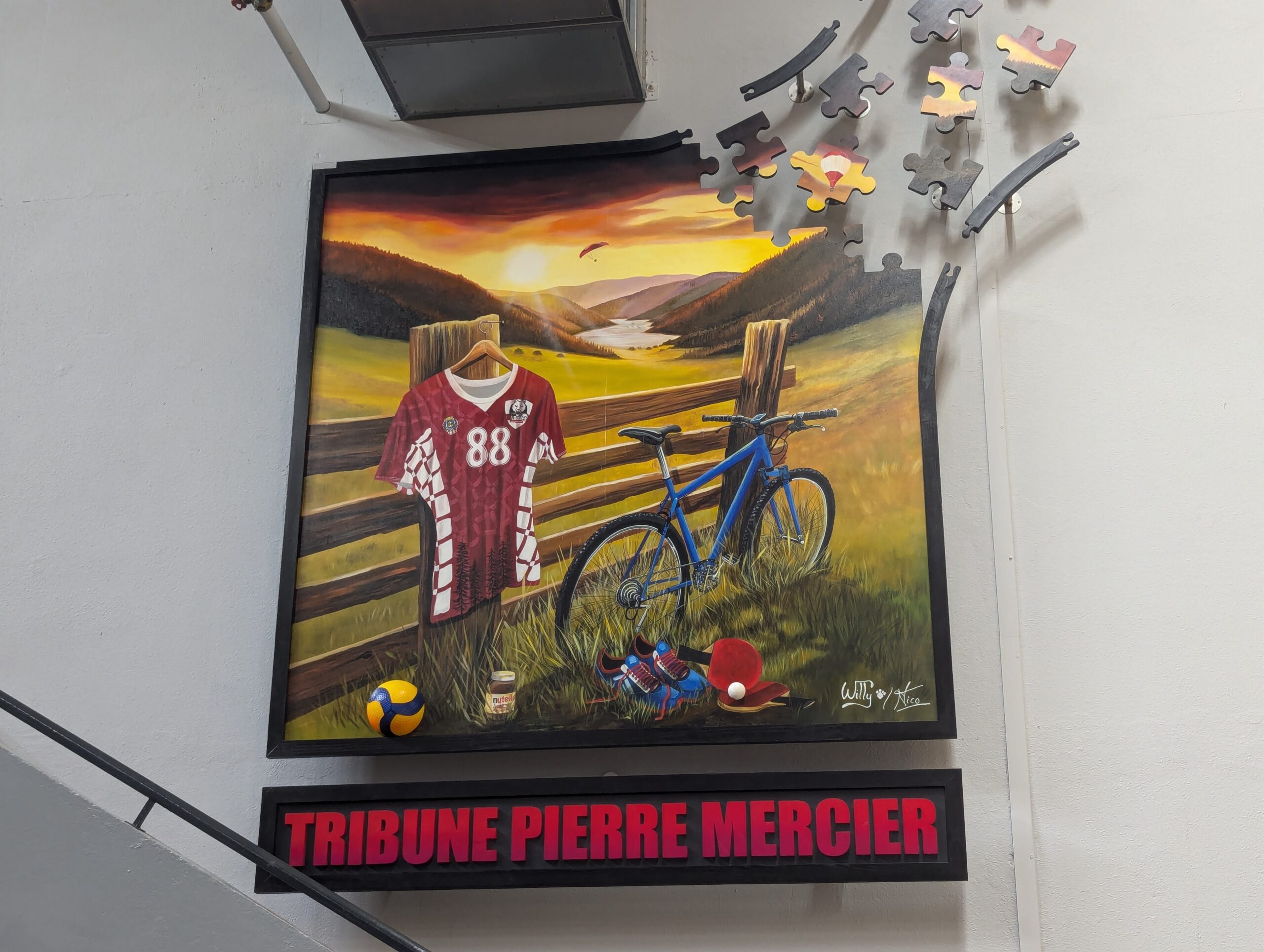 La tribune, qui a été récemment modifiée pour totaliser 1800 places assises, fait face au terrain de volley-ball où les Louves reçoivent leurs adversaires lors des différents matchs de championnat, de coupe ou amicaux. De part et d’autre de la tribune, 2 œuvres ont été installées, représentant les Louves d’un côté, les sports qui favoris de Pierre Mercier de l’autre côté. Réalisées par les artistes locaux Willy et Nico, les 2 grandes peintures ont été dévoilées hier soir lors de l’inauguration de la tribune.