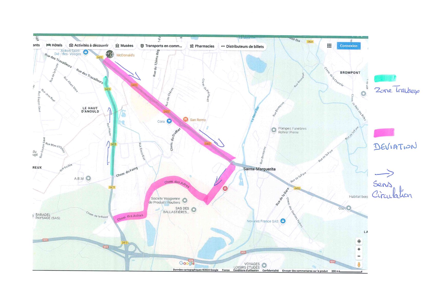 « Pour les automobilistes qui quittent la cité de Déodat, une déviation sera mise en place au niveau des feux tricolores, rue d’Alsace, empruntera la D420 jusqu’au rond-point de la pharmacie du Progrès puis remontera la rue des Aulnes jusqu’aux feux situés au faing de Sainte-Marguerite » précise la Communauté d’Agglomération de Saint-Dié-des-Vosges à propos de la circulation pendant la durée des travaux.