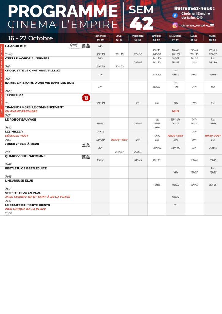 Deprecated: Use of "parent" in callables is deprecated in /project/VIDEV/web/app/plugins/simple-lightbox/includes/class.options.php on line 501 Au cinéma l’Empire du 16 au 22 octobre - Saint Die Info