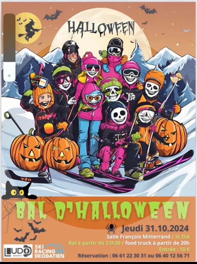 Le Ski Racing Déodatien organise son bal d’Halloween, ce jeudi 31 octobre à l’Espace François-Mitterrand. Animé par Ludovic Chopat et Julien Masson, le bal débutera à 21h30, sachant qu’un food-truck sera sur place à partir de 20h. L’entrée est à 10€, sachant qu’une réservation est conseillée mais pas obligatoire, par téléphone au 06-61-22-30-31 ou 06-40-12-56-71.