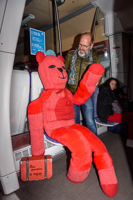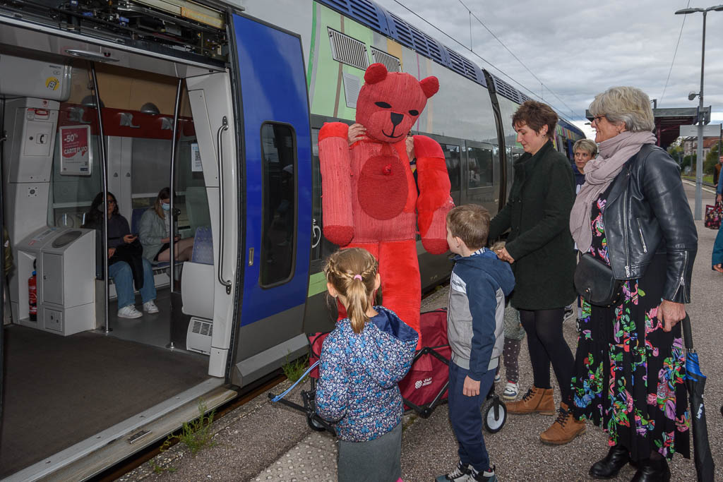Pour sa dernière apparition avant de partir vers de nouveaux horizons, l’Ours Rouge était présent au 35e Festival International de Géographie, notamment au FIG Junior. Dimanche en fin de journée, alors que le festival touchait à sa fin, il s’est rendu à la gare déodatienne pour prendre le train, accompagné de Claude Kiener, vice-présidente de la Communauté d’Agglomération déléguée à la Culture, de la responsable du CTEAC Delphine Courant et de la compagnie « En attendant ».