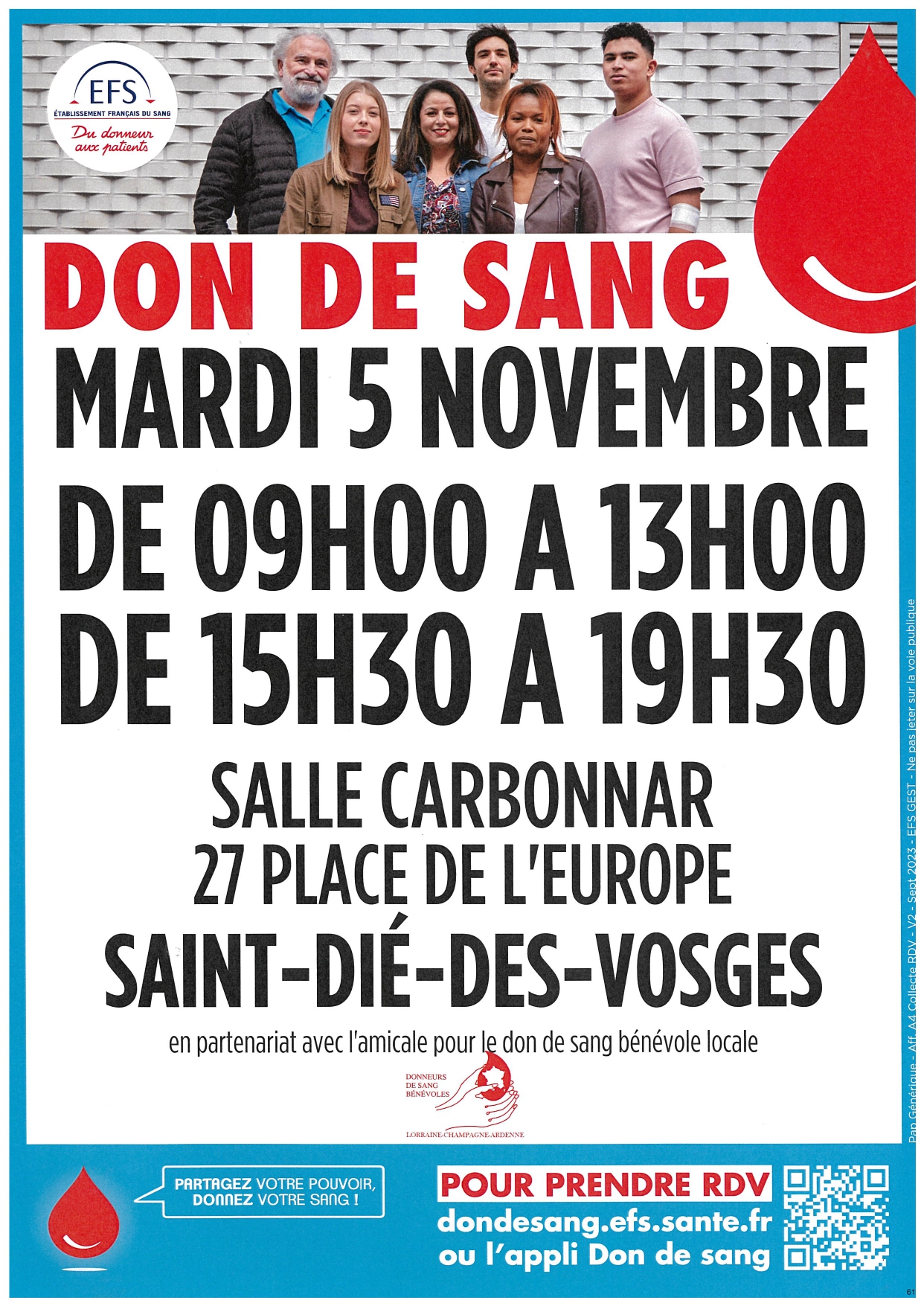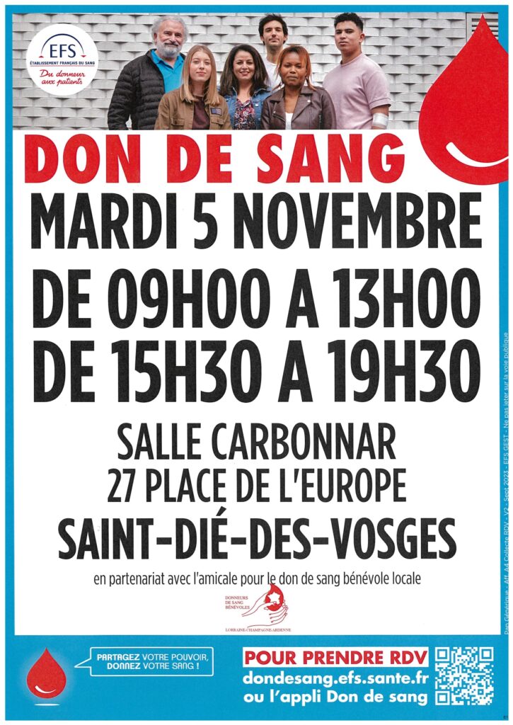 La prochaine collecte de sang organisée à Saint-Dié-des-Vosges par l’Etablissement Français du Sang – EFS – Grand Est, avec le soutien de l’amicale locale des Donneurs de Sang bénévoles, aura lieu le mardi 5 novembre prochain, de 9h à 13h puis de 15h30 à 19h30 à la salle Carbonnar. Pour prendre rendez-vous, facultatif mais conseillé, rendez-vous sur https://dondesang.efs.sante.fr.