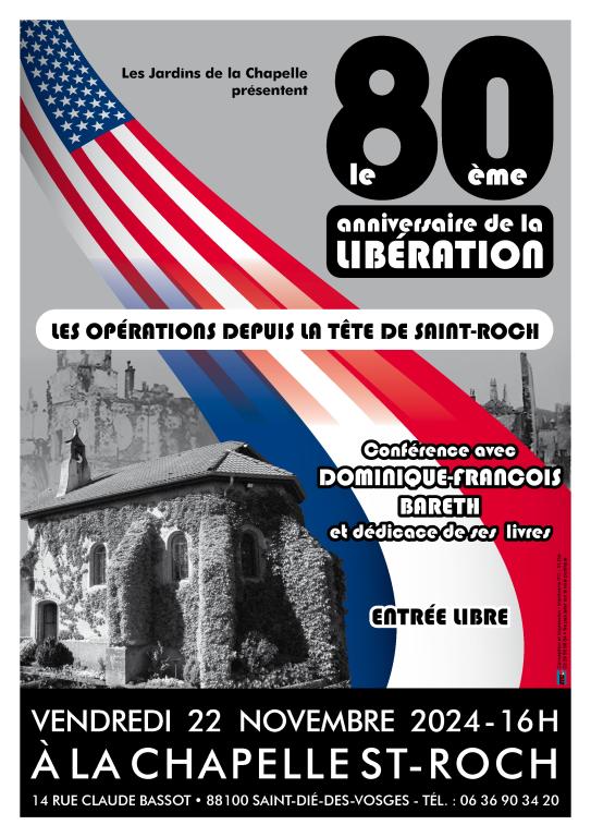 Au mois de novembre, les Jardins de la Chapelle Saint-Roch organisent une exposition ainsi qu’une conférence. Respectivement, Maxence Piquet présentera à partir du samedi 16 novembre l’exposition « Les Autres », et Dominique-François Bareth donnera une conférence sur la 80e anniversaire de la Libération de Saint-Dié le vendredi 22 novembre, à 16h, avec une dédicace de ses livres. Entrée libre dans les 2 cas.