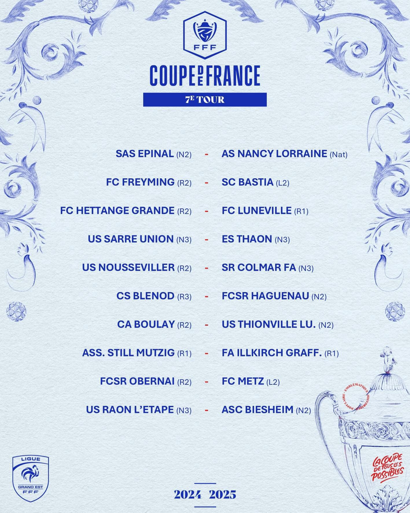 C’est dans le cadre du 7e tour de la Coupe de France que l’US Raon-l’Etape recevra l’ASC Biescheim Football (N3) le week-end des 16 et 17 novembre. En cas de victoire des Raonnais, ils pourraient ensuite affronter le FC Metz (L2) ou Obernai (R2).