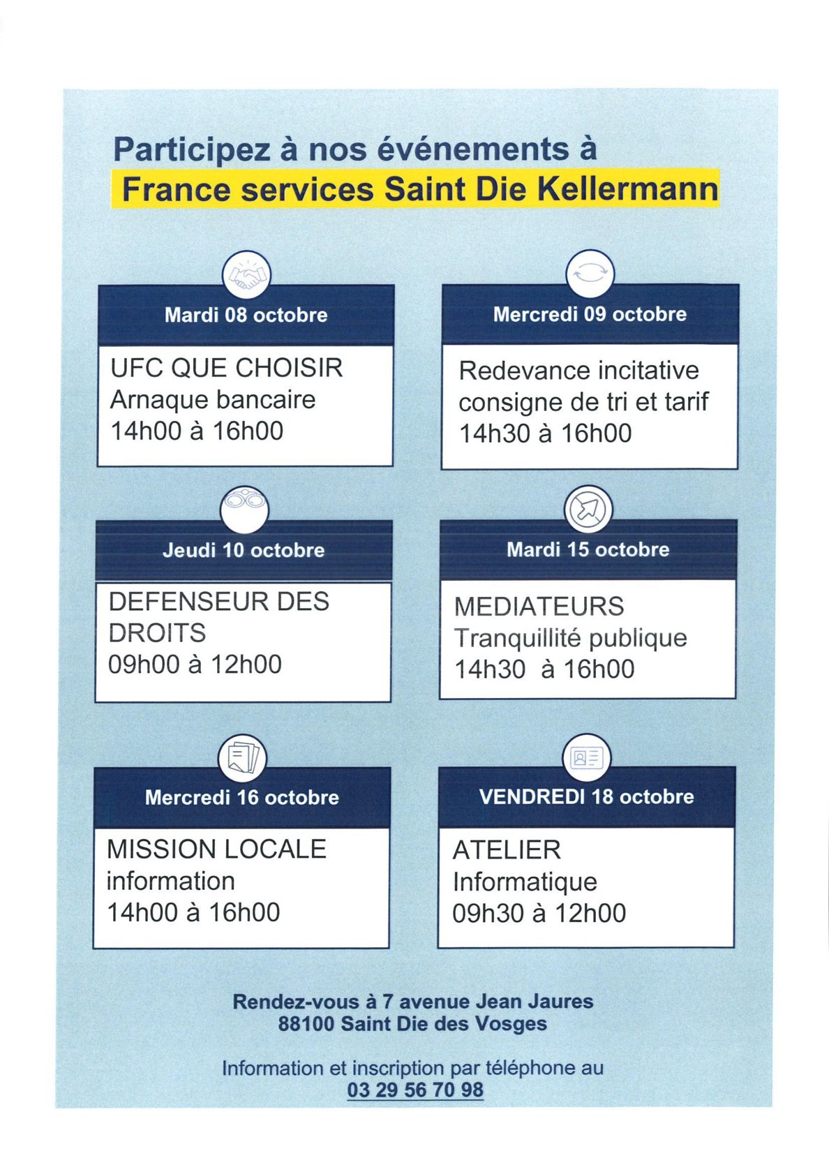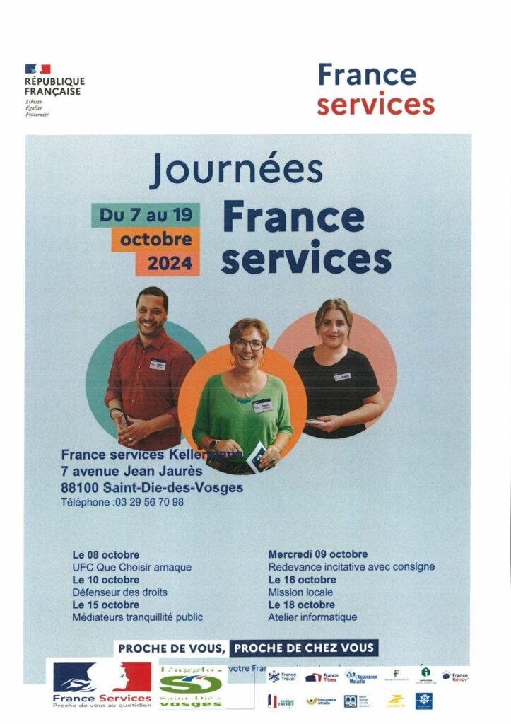 Dans le cadre des 4e Journées France Services, la Maison France Services de Kellermann, située au 7 avenue Jean-Jaurès à Kellermann, organise du 7 au 19 octobre différents événements, ateliers et animations. L’occasion de rencontrer les agents et leurs partenaires, mais aussi mieux comprendre leurs services. Renseignements complémentaires et inscriptions par téléphone, au 03-29-56-70-98. Le programme détaillé est à retrouver ci-dessous :