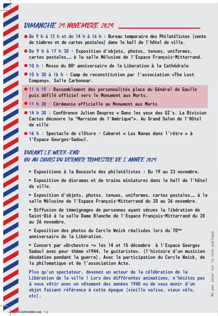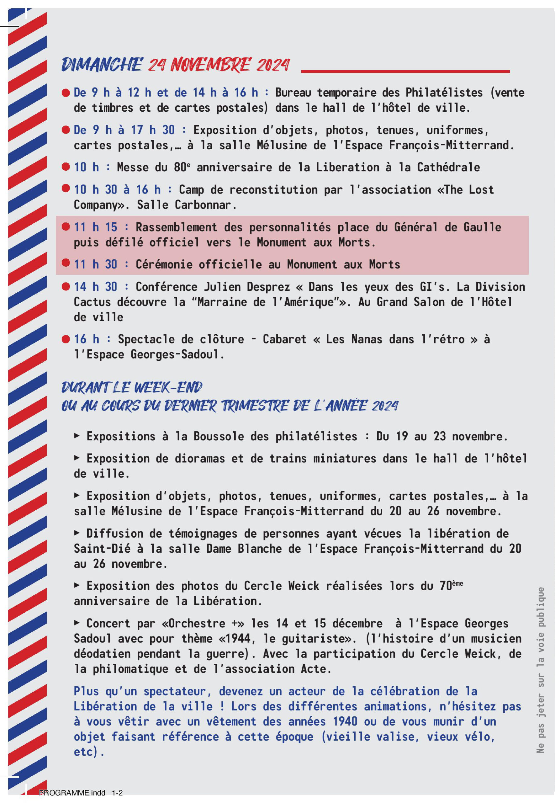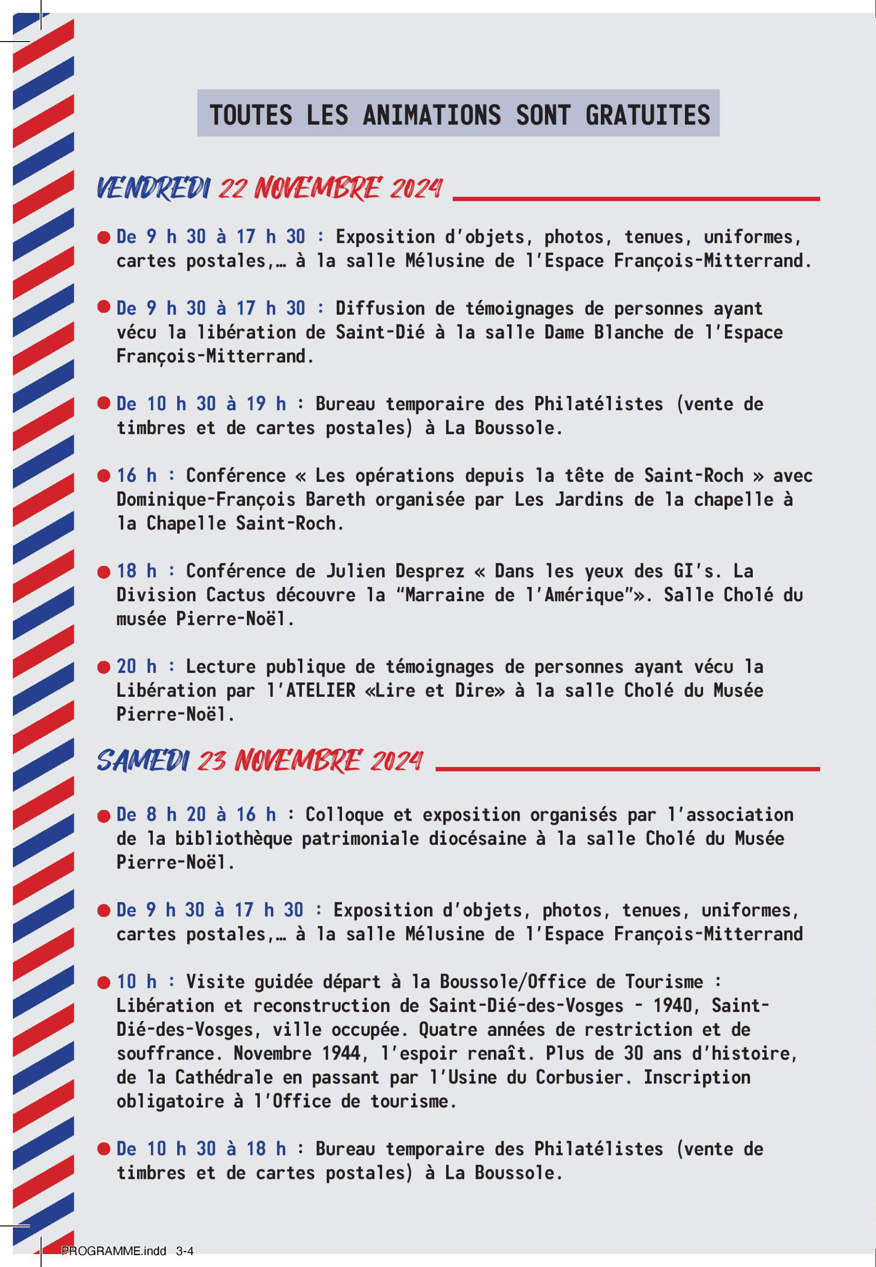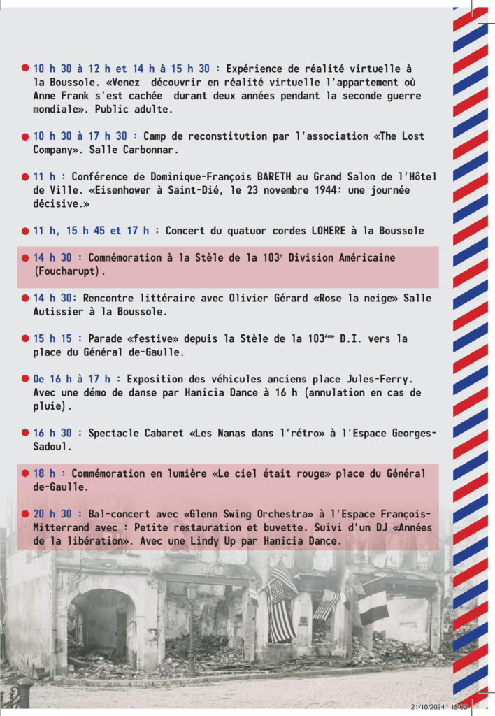 À l’occasion du 80e anniversaire de la Libération de Saint-Dié-des-Vosges et des 80 ans du dynamitage de la cathédrale, de nombreuses commémorations et festivités viendront animer la ville durant les 23 et 24 novembre. La Municipalité, les associations et les écoles se mobilisent pour faire de cet événement un moment inoubliable.