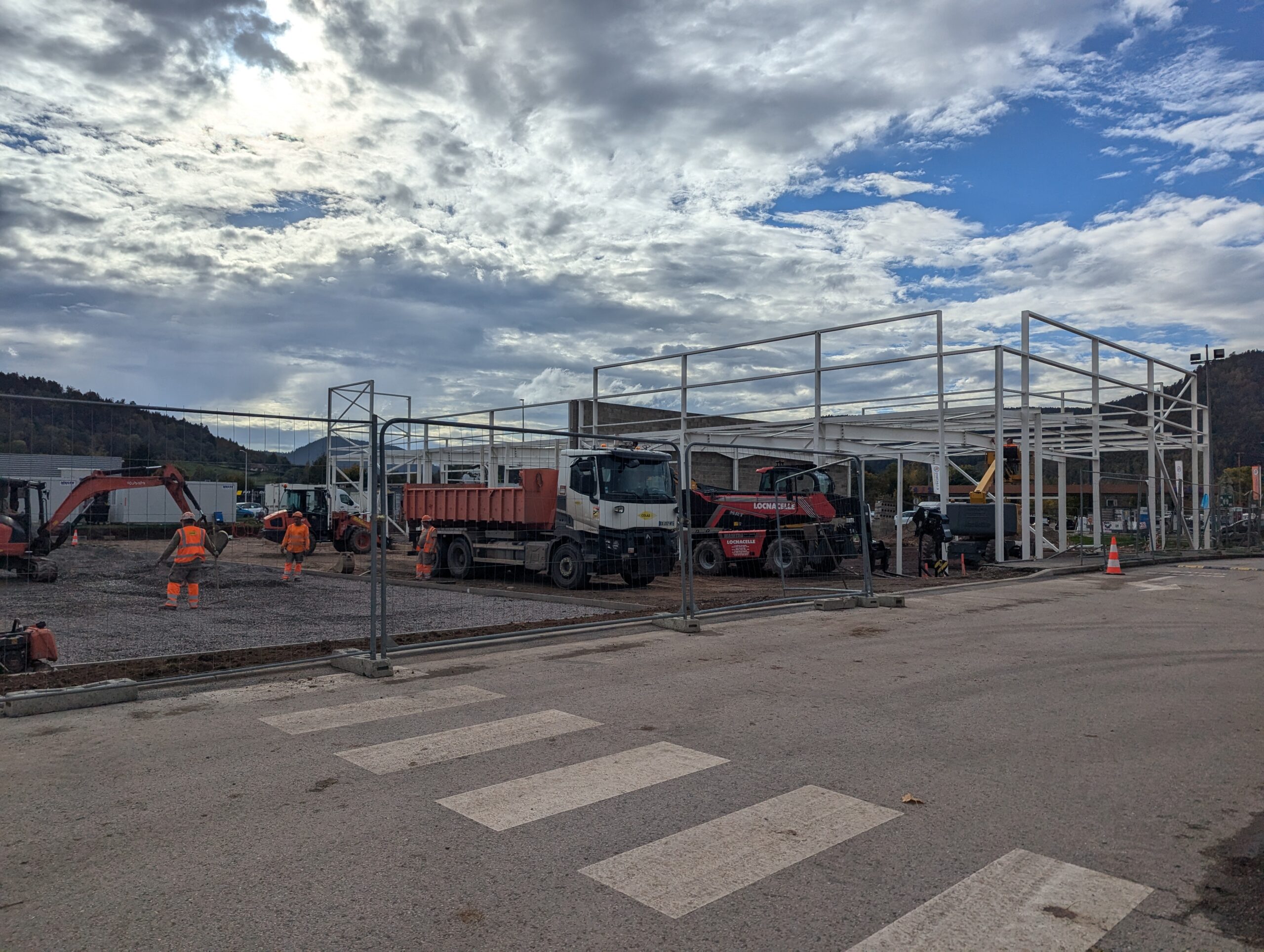 Alors que les travaux ont démarré à la mi-août, avec les premiers coups de pelleteuse, le chantier continue d’avancer à bon train car un mur et la structure métallique des 2 futurs restaurant et boulangerie ont été montés ces derniers jours. A ce rythme, une ouverture au début de l’année prochaine semble réaliste.