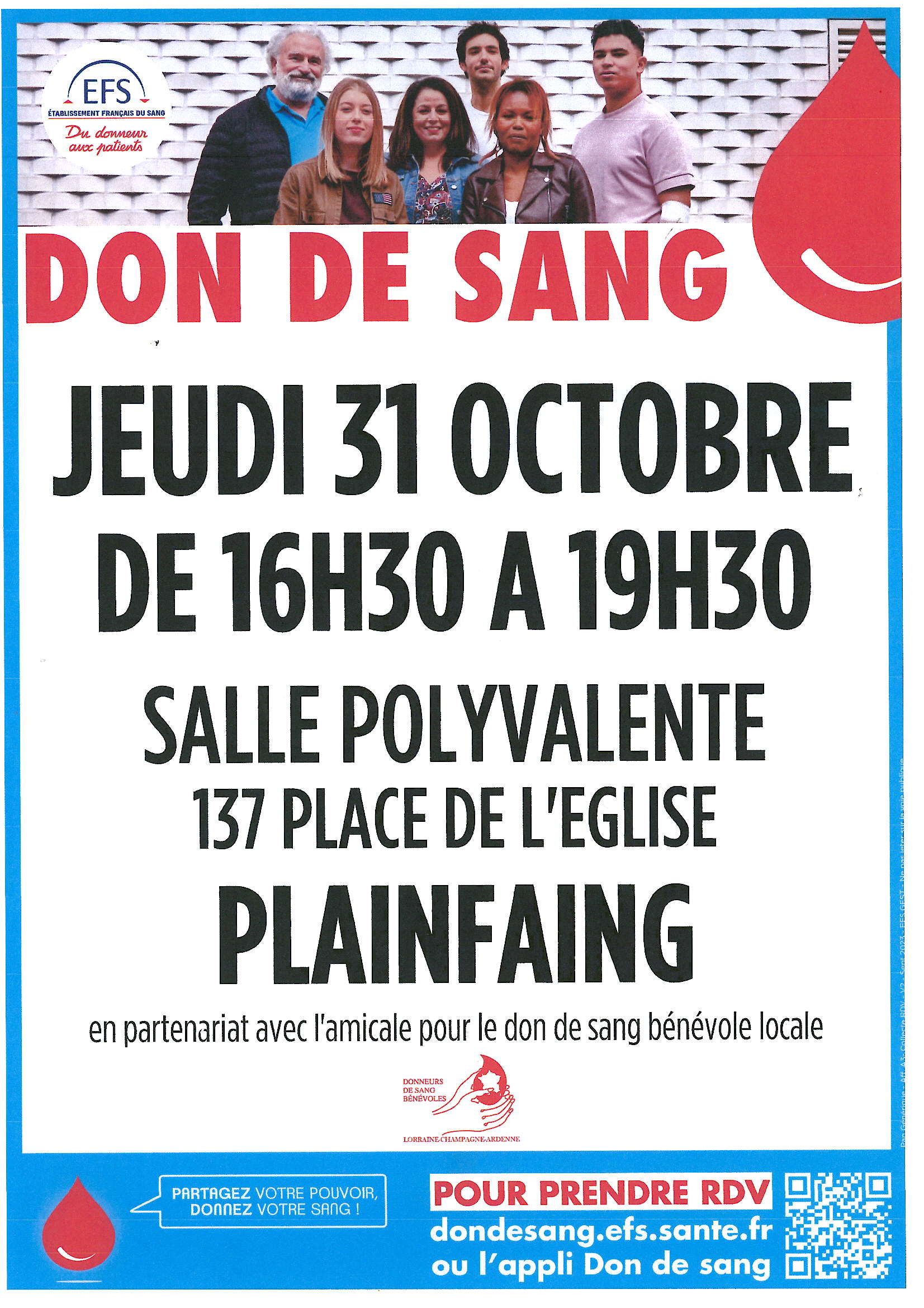 Une collecte de sang est organisée par l’EFS Grand Est, en partenariat avec l’amicale locale pour le don de sang bénévole, le jeudi 31 octobre prochain à Plainfaing, de 16h30 à 19h30 à la salle polyvalente de la commune (137 place de l’Eglise).