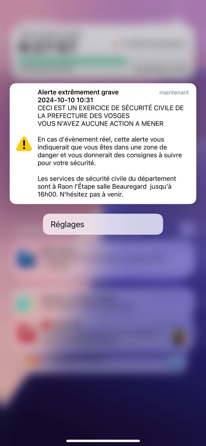 L’objectif du test réalisé aujourd’hui a Raon-l’Etape étant de renforcer la réactivité des secours et forces de l’ordre face aux situations d’urgence. « Grâce à FR-Alert, nous serons mieux préparés pour faire face aux risques et prendre les bonnes décisions en cas de crise » explique la Préfecture des Vosges.
