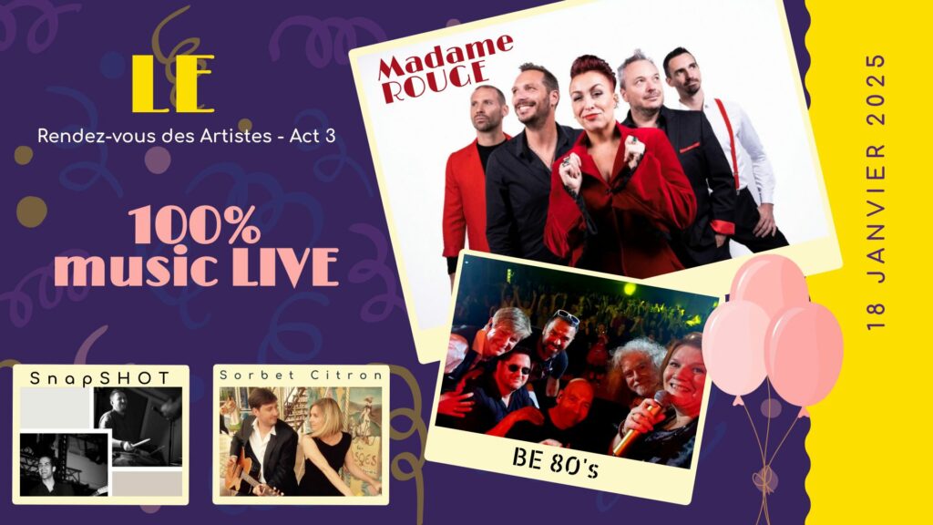 Le lendemain samedi, pas moins de 4 formations musicales se succéderont sur la scène margaritaine : Snapshot, qu’on ne présente plus en Déodatie ; Sorbet Citron, duo accoustique bien connu dans les Vosges, notamment du côté de Gérardmer ; BE 80’s, un cover band professionnel de 6 musiciens qui joueront un concert de 2h spécial années 80 new wave ; Madame Rouge, groupe aquitain basé à Bordeaux et dans les Landes, formé autour de 5 musiciens professionnels depuis maintenant plus de 15 ans. L’entrée pour cette seconde soirée est à 18€.