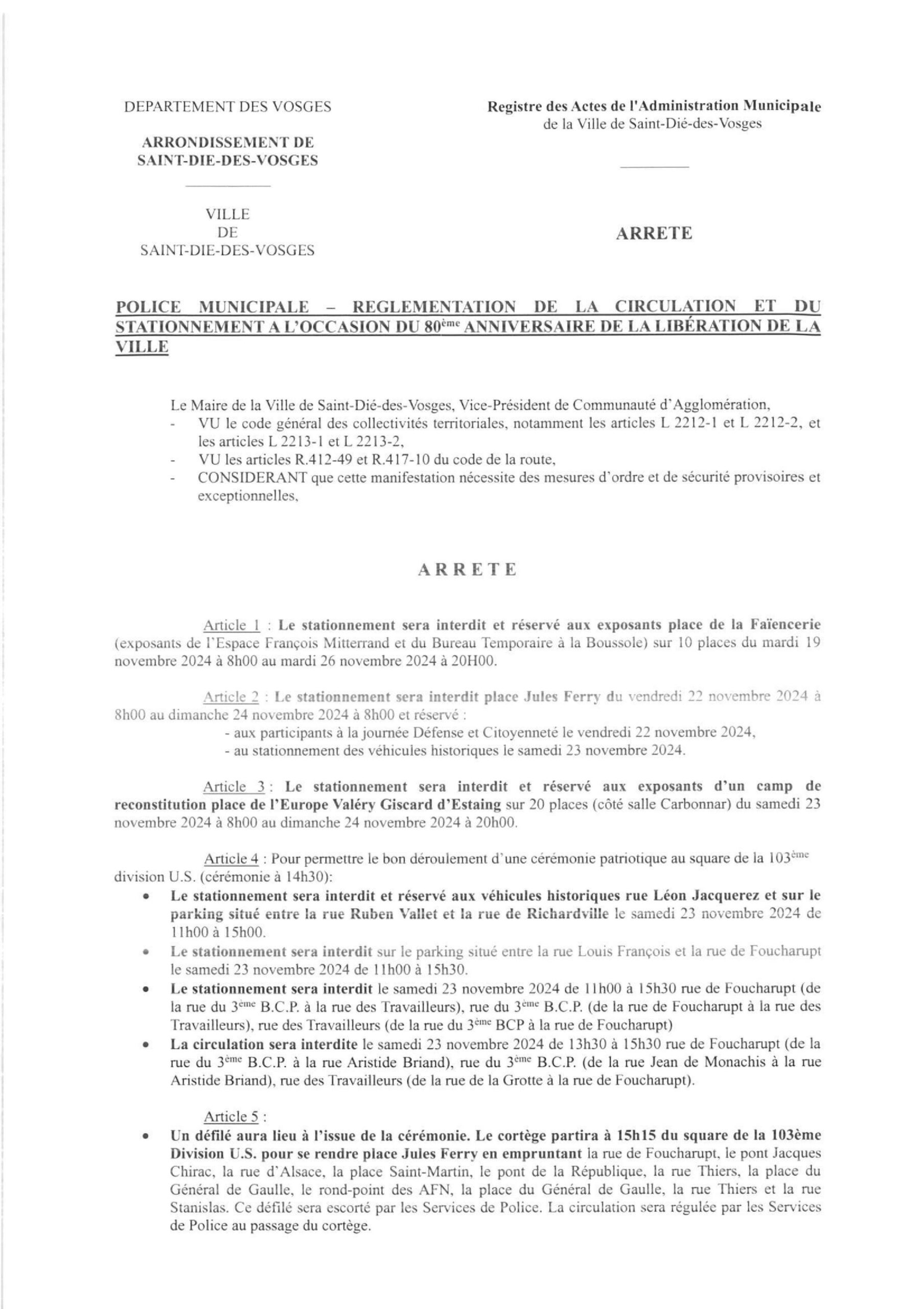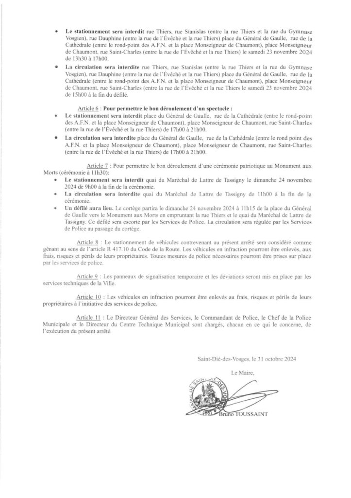 Ce week-end d’anniversaire implique des modifications temporaires de circulation et de stationnement, à différents endroits de la ville. Tous les détails sont à retrouver dans l’arrêté municipal ci-dessous, en date du 31 octobre 2024 (cliquer sur les images pour les agrandir) :