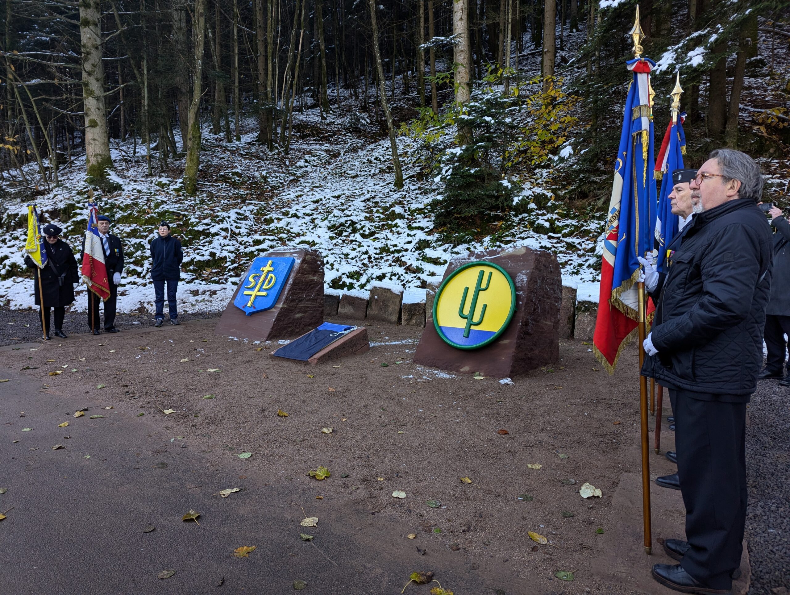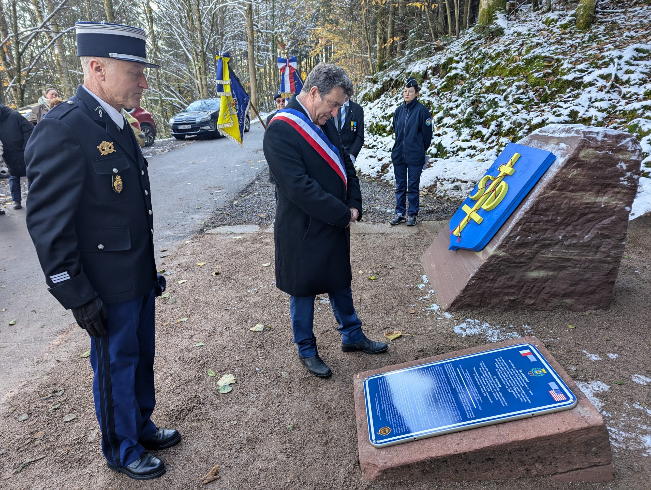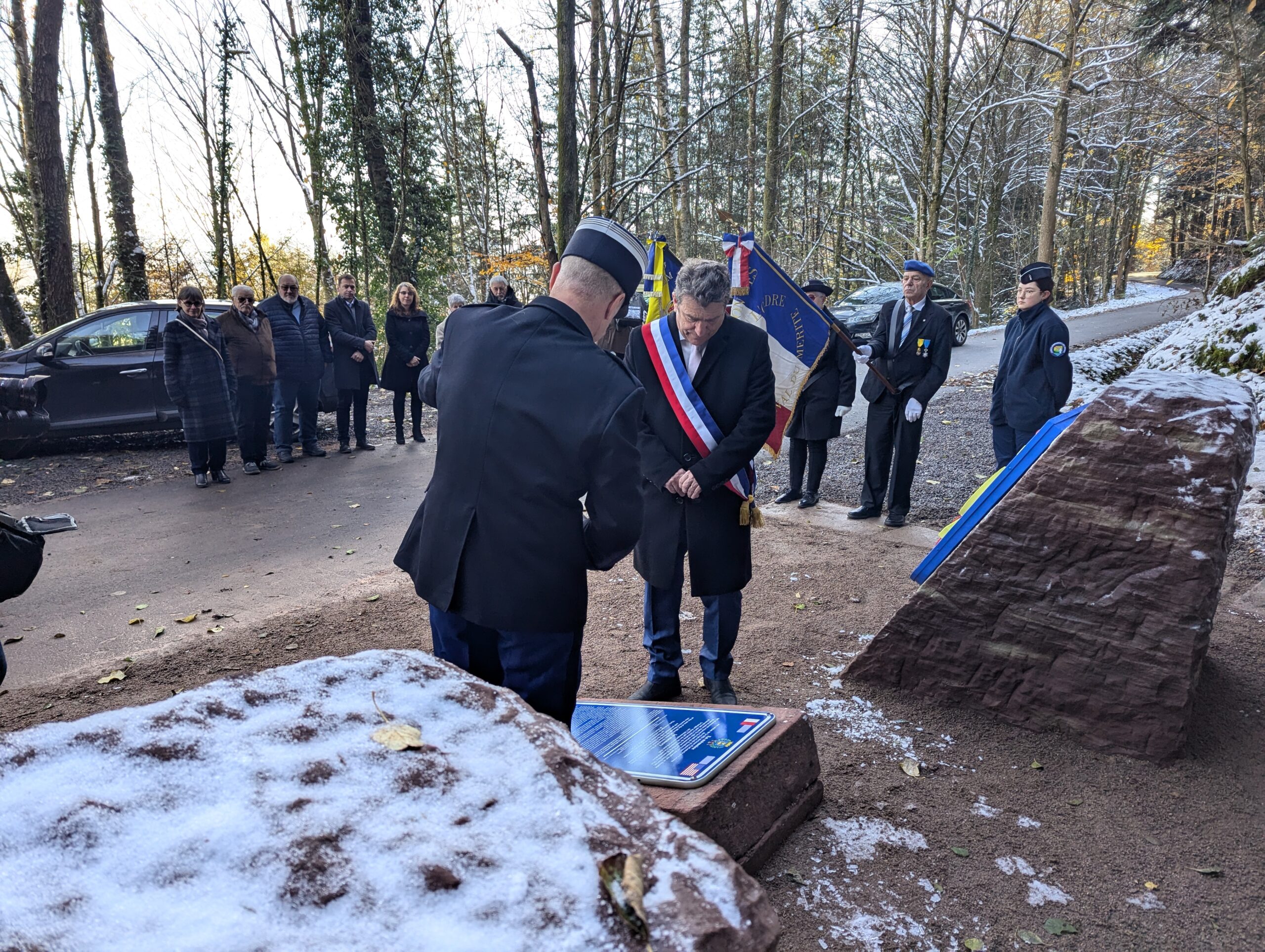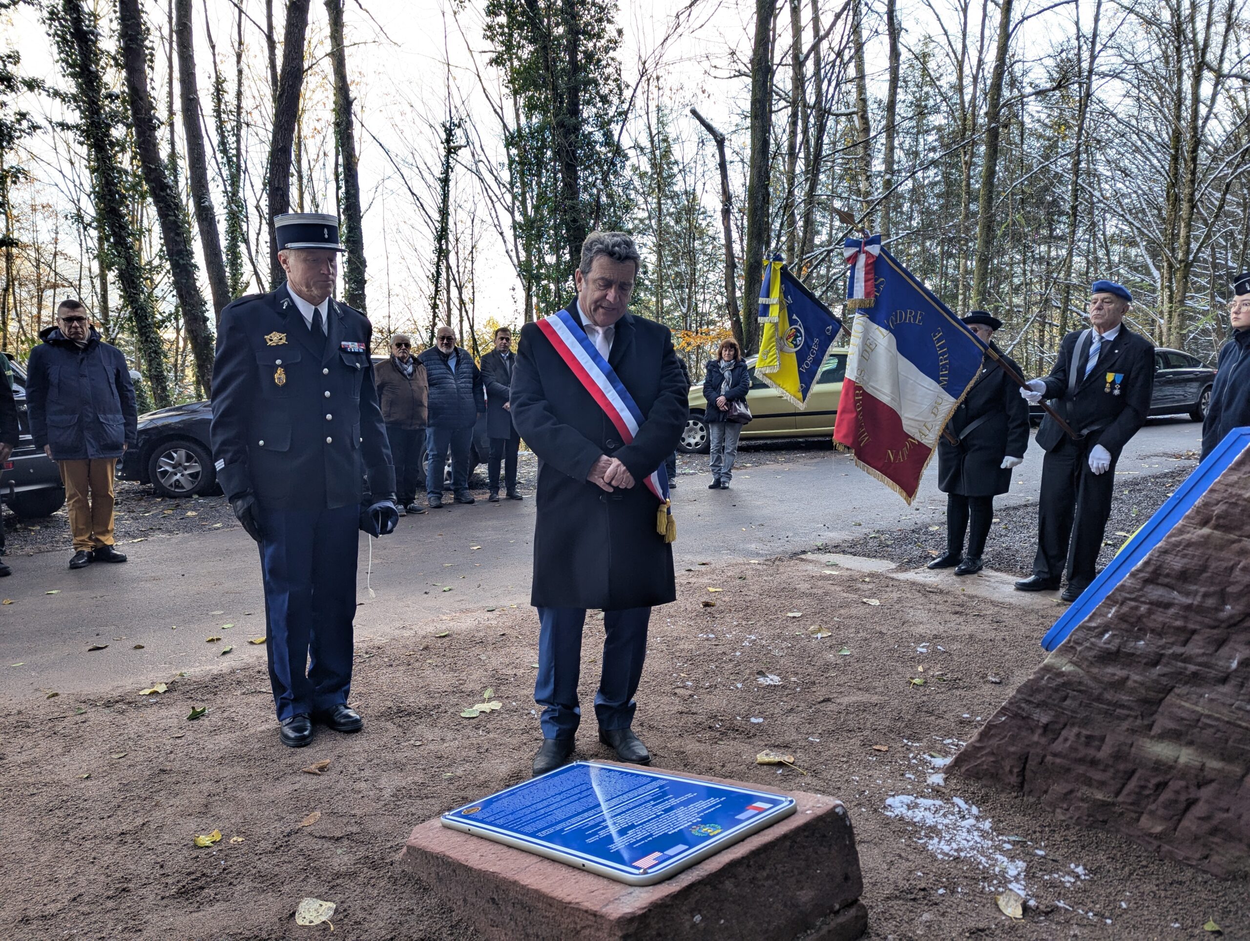 Ce samedi matin, c’est sur les coups de 10h que le maire Bruno Toussaint a dévoilé la plaque commémorative à la mémoire des soldats de la 103e DI US, entourée de par et d’autre du blason de Saint-Dié et de l’insigne de la Division.