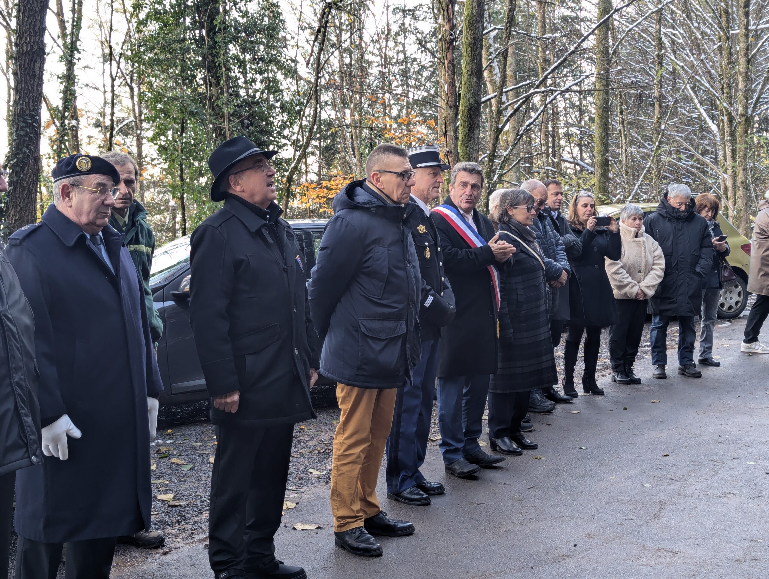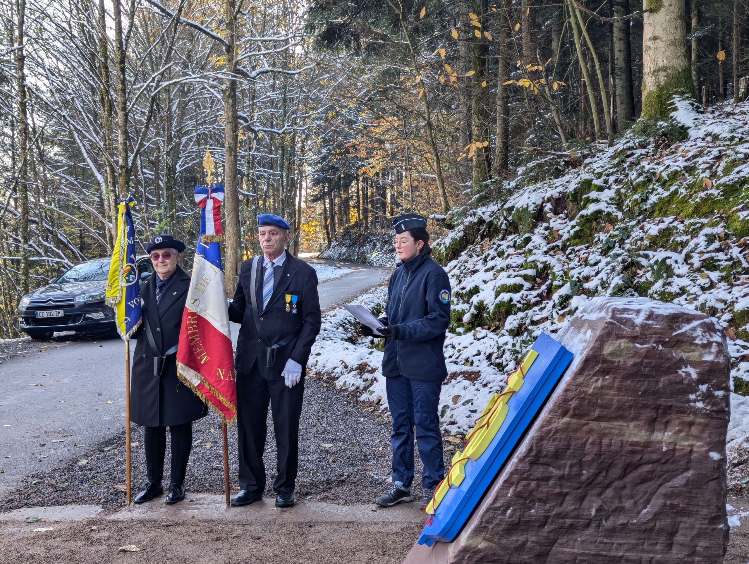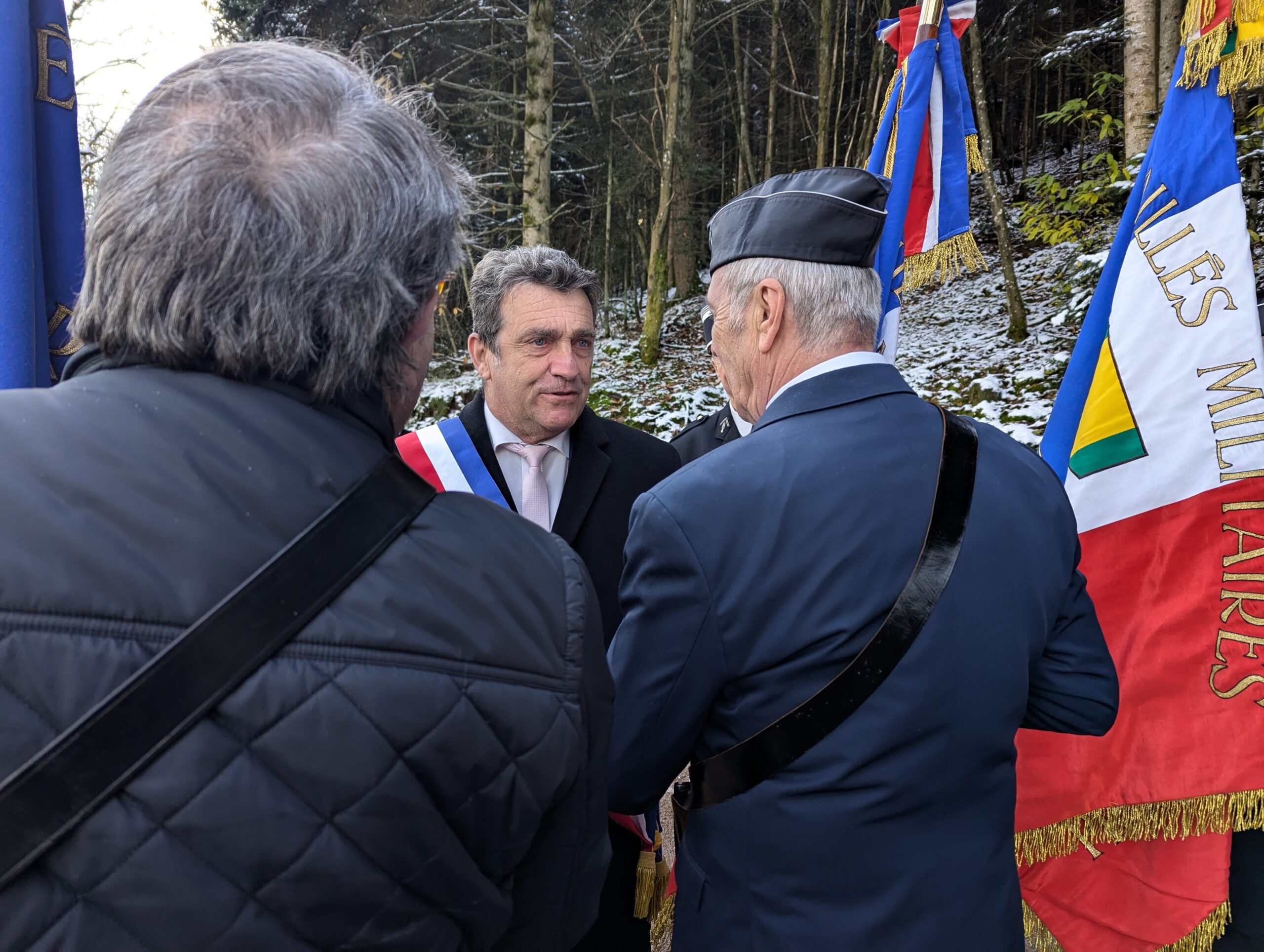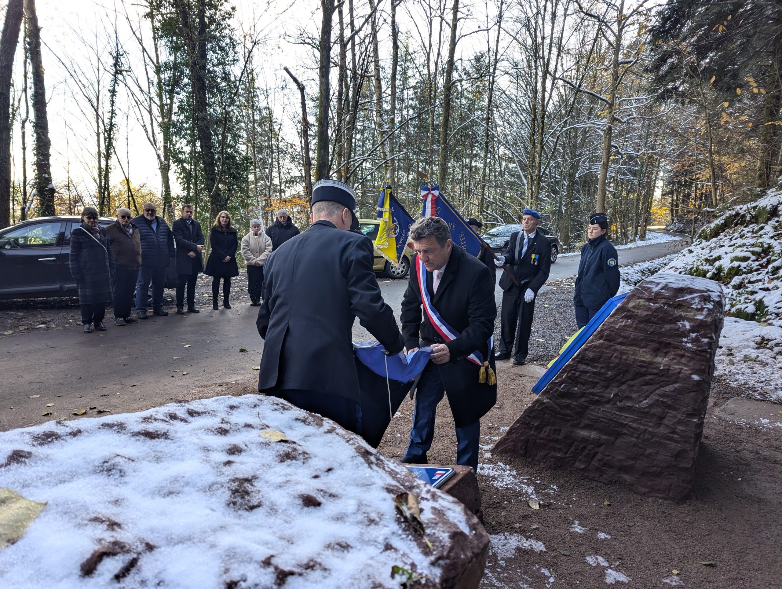 Ce samedi matin, c’est sur les coups de 10h que le maire Bruno Toussaint a dévoilé la plaque commémorative à la mémoire des soldats de la 103e DI US, entourée de par et d’autre du blason de Saint-Dié et de l’insigne de la Division.
