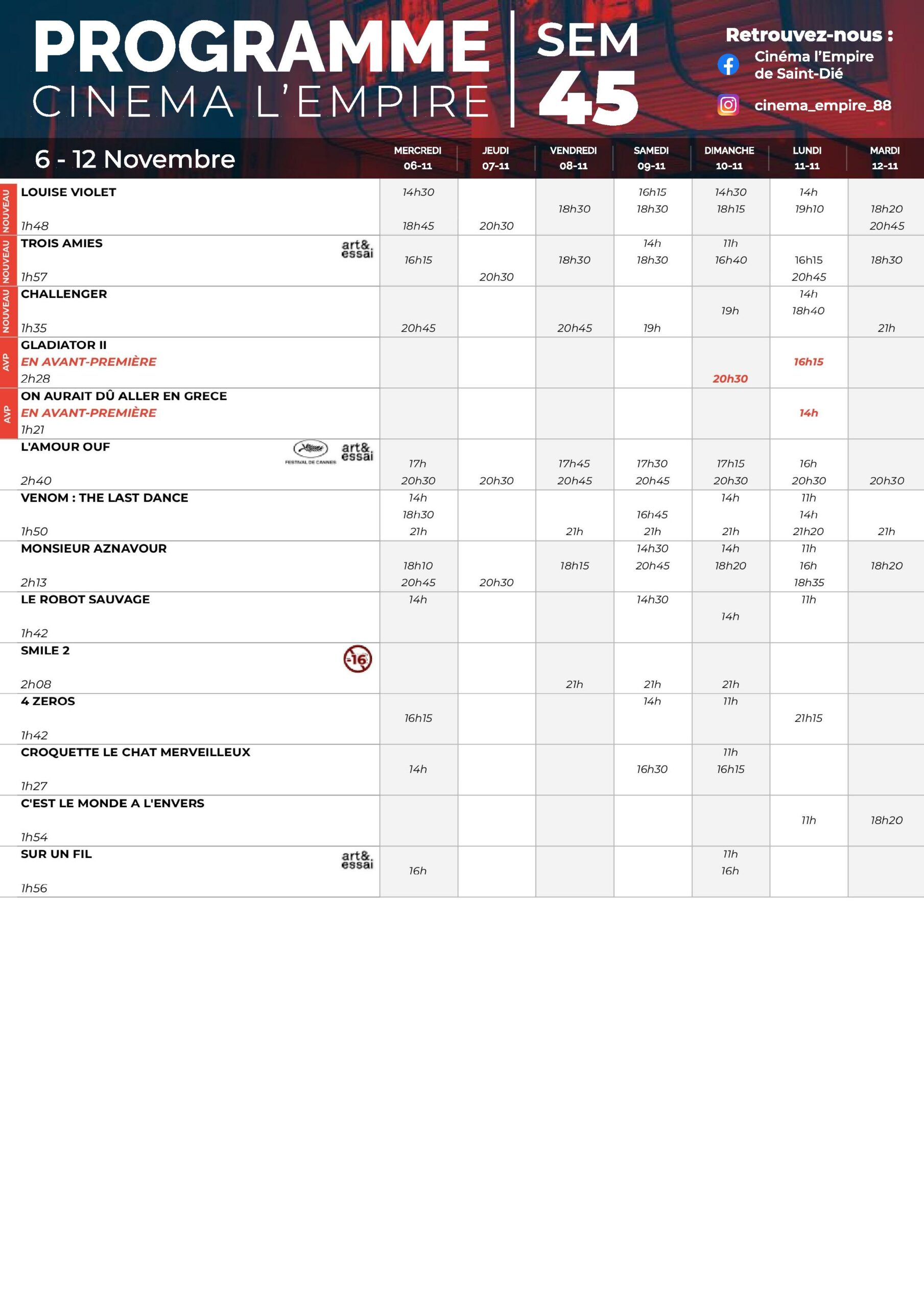 Deprecated: Use of "parent" in callables is deprecated in /project/VIDEV/web/app/plugins/simple-lightbox/includes/class.options.php on line 501 Au cinéma l'Empire du 6 au 12 novembre - Saint Die Info