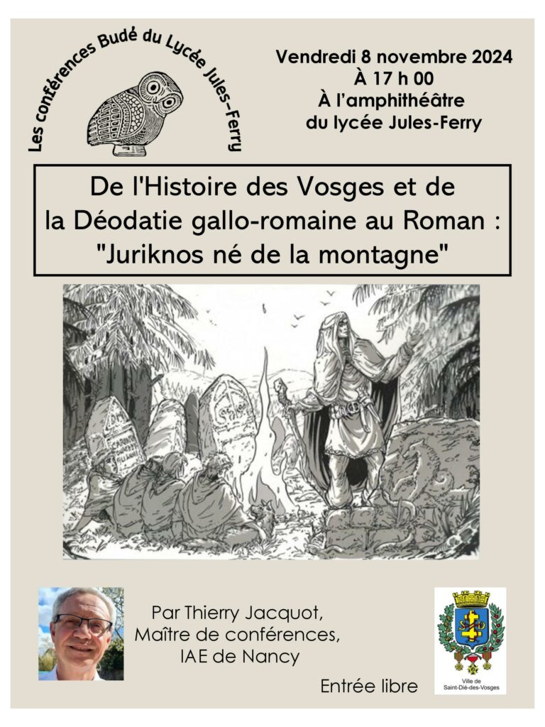 La prochaine conférence Budé se tiendra ce vendredi 8 novembre, à 17h à l’amphithéâtre de la Cité Scolaire Jules-Ferry. Cette conférence, intitulée « De l’Histoire des Vosges et de la Déodatie gallo-romaine au Roman : Juriknos né de la montagne », sera animée par le maître de conférences Thierry Jacquot. Entrée libre. Pour toute informations complémentaire : association.bude88@gmail.com.