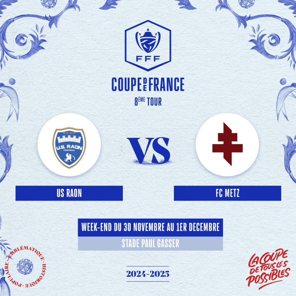 Le choc entre l’US Raon-l’Etape et le FC Metz sera joué ce week-end, soit samedi 30 novembre soit le lendemain dimanche 1er novembre. L’exploit est possible pour les Raonnais, qui n’ont jamais tremblé face aux grosses équipes, comme contre Saint-Etienne en 2016 (1-1, défaite aux tirs aux buts) ou contre Lille en 2020 (défaite 2-3).