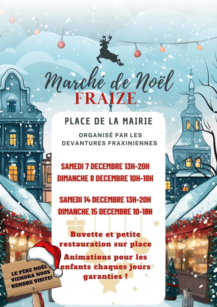 L’association Les Devantures Fraxiniennes organise son marché de Noël, qui aura lieu sur la place de l’Hôtel de Ville de Fraize, le week-end des 7 et 8 décembre puis des 14 et 15 décembre prochains. De 13h à 20h les samedis, de 10h à 18h les dimanches. Au programme : animations pour les enfants, buvette et petite restauration… et la visite du Père Noël en personne !