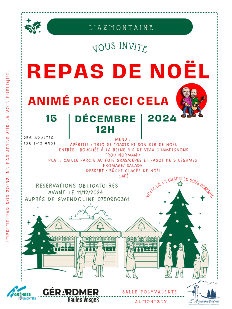 L’association l’Azmontaine vous invite à sa manifestation annuelle organisé dans le cadre de Noël à la salle polyvalente d’Aumontzey.