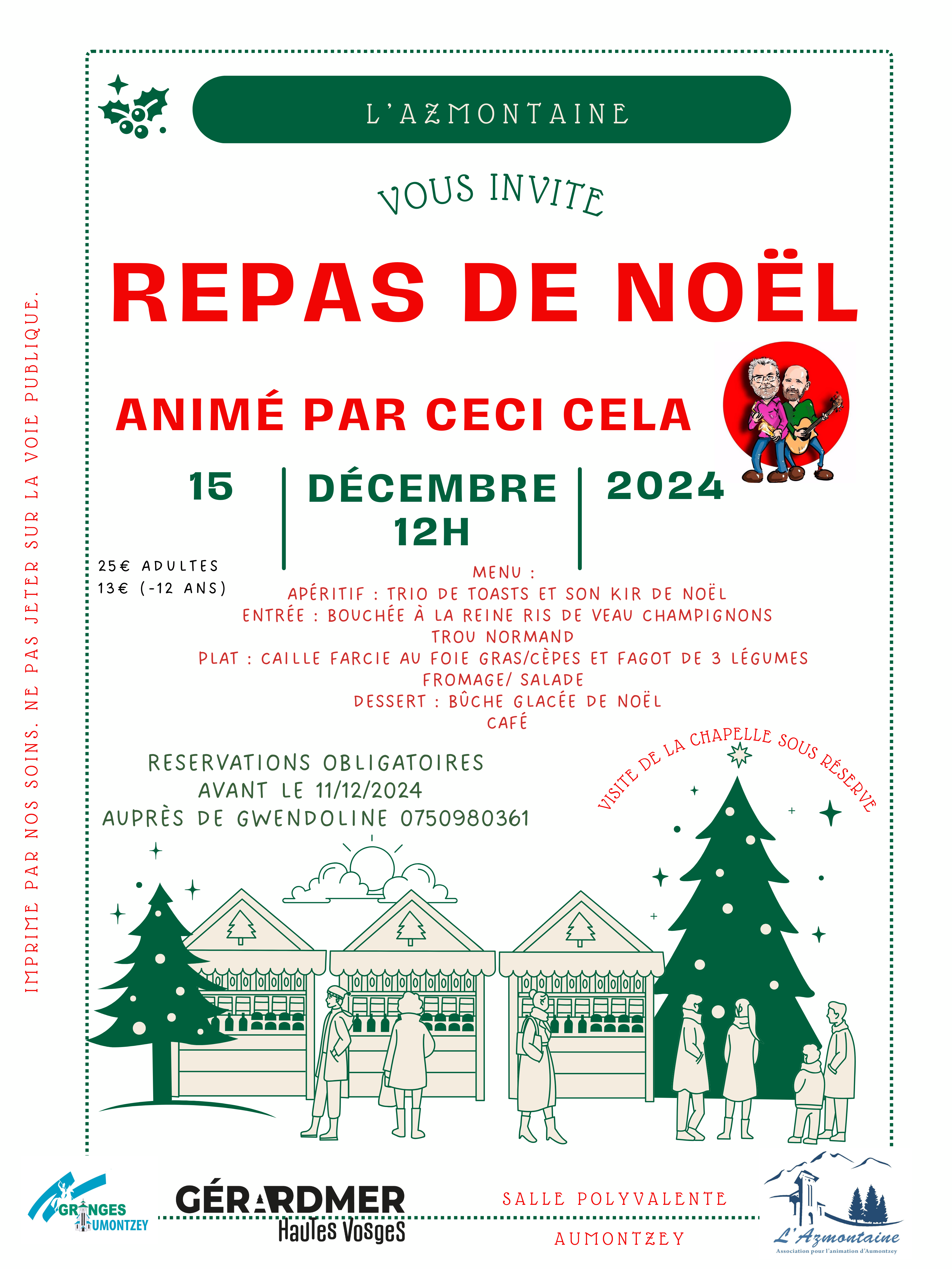 – dimanche midi 15 décembre : repas animé par le groupe Ceci Cela – réservation obligatoire auprès de Gwendoline au 07 50 98 03 61