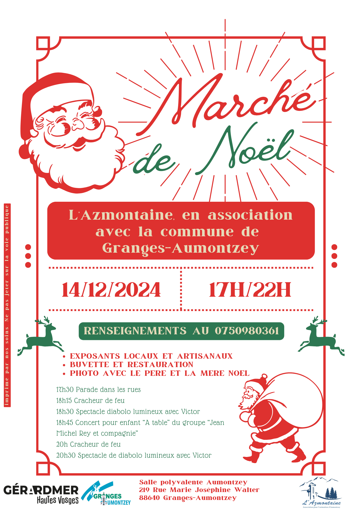– samedi 14 décembre à partir de 17 h 00, le marché de Noël dans la salle polyvalente de Aumontzey avec défilé sur un char des enfants dans les rues, séance photo avec père et mère Noël, cracheur de feu le soir, spectacle avec la compagnie Jean Michel Rey, spectacle de diabolo lumineux et restauration rapide le soir avec frites, tartes flambées, gaufres, vin chaud et bière de Noël etc..