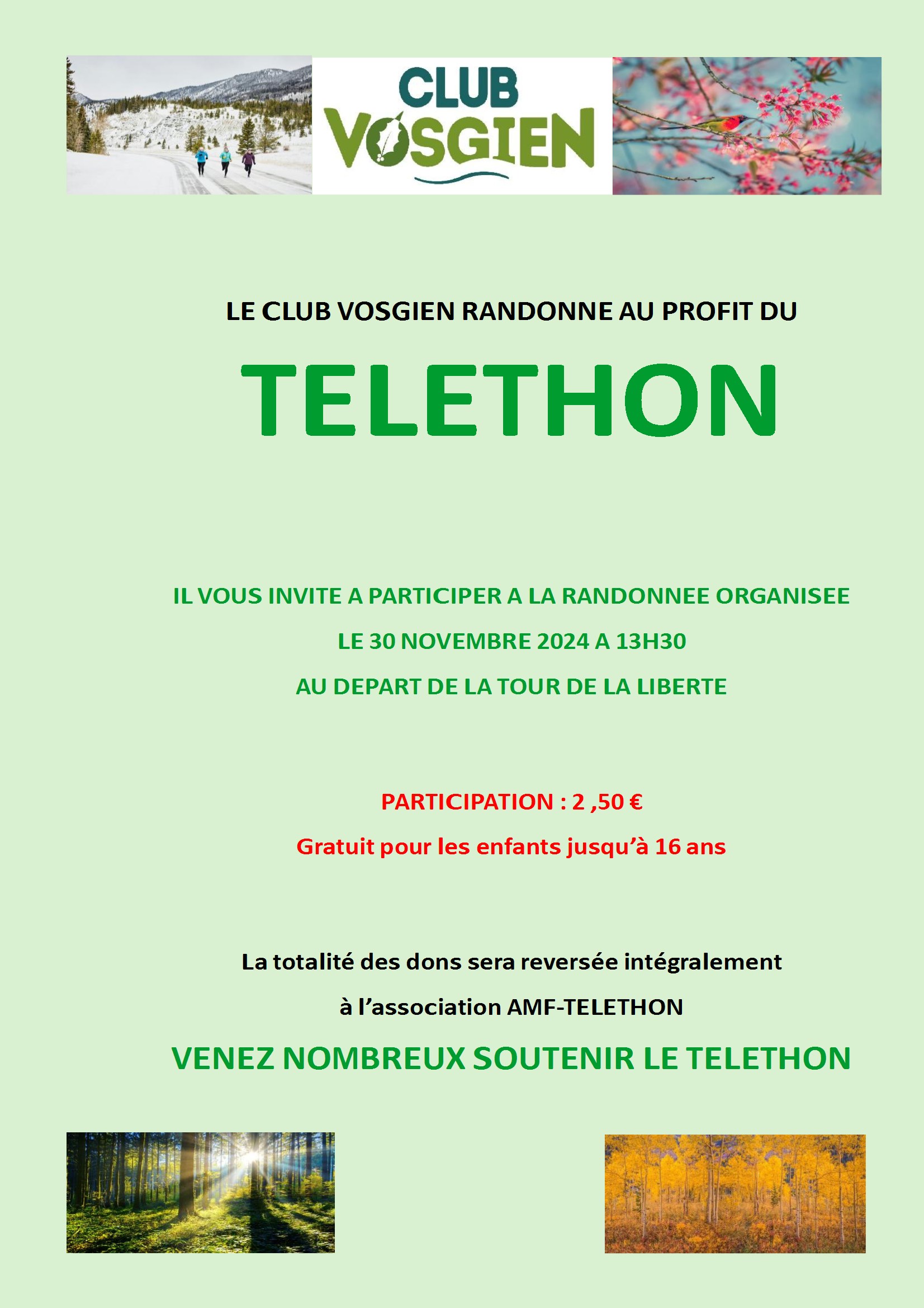 Le Club Vosgien de Saint-Dié-des-Vosges se mobilise en faveur du Téléthon, en organisant une randonnée ouverte à tous le samedi 30 novembre. Une randonnée caritative dont le départ sera donné à 13h30 au pied de la Tour de la Liberté. Une participation de 2,50€ est demandée à chaque marcheuse et marcheur, sachant que la randonnée est gratuite jusqu’à 16 ans. La totalité de la somme des inscriptions sera ensuite reversée intégralement à l’AFM-Téléthon.