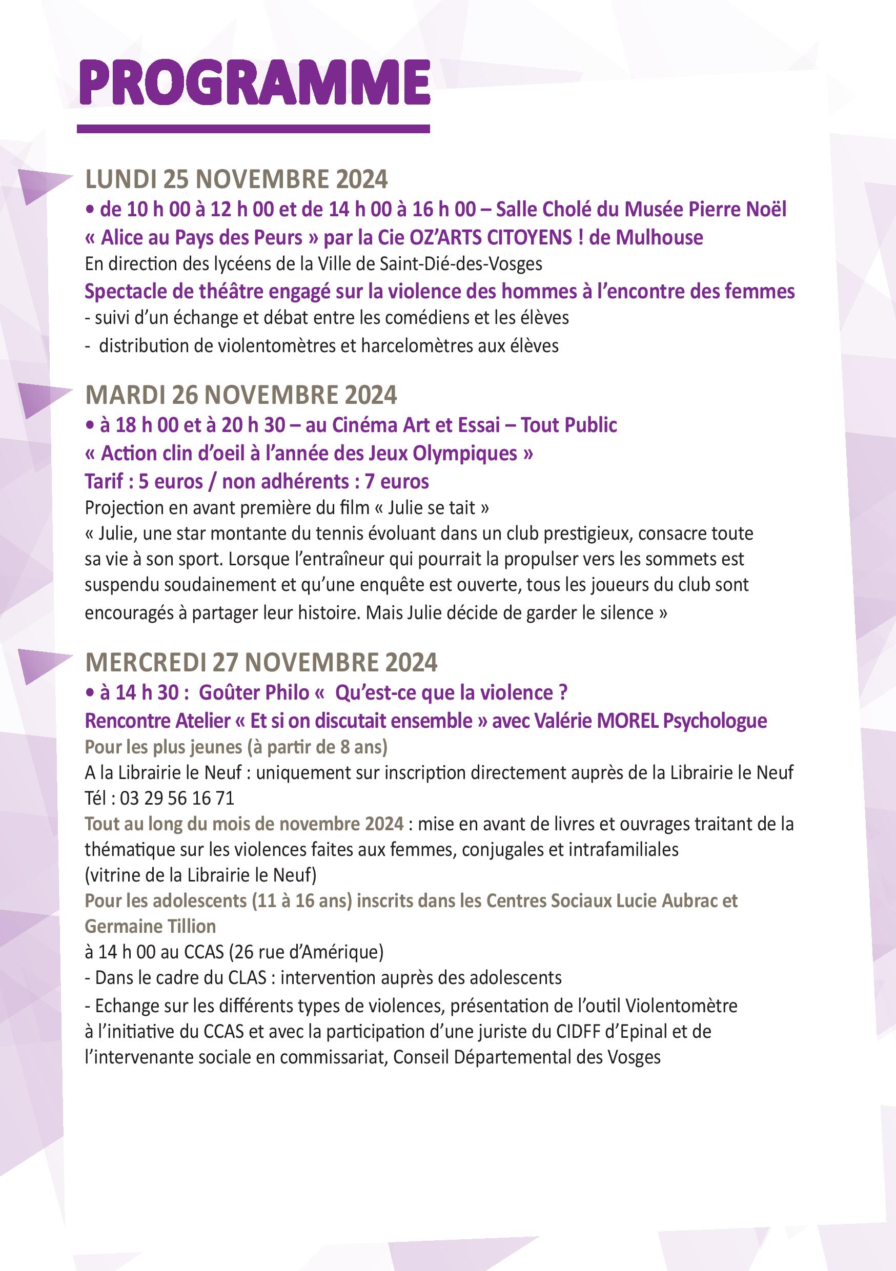 Puis le programme se poursuivra les jeudi 21, lundi 25, mardi 26 et mercredi 27 novembre prochains, avec un quizz sur le thème des violences conjugales et intrafamiliales, une diffusion du clip « Sortir du silence », du spectacle de théâtre engagé avec la Compagnie Oz’Arts Citoyens !, une projection au cinéma l’Excelsior, un goûter philo et une rencontre atelier avec une psychologue, Valérie Morel.