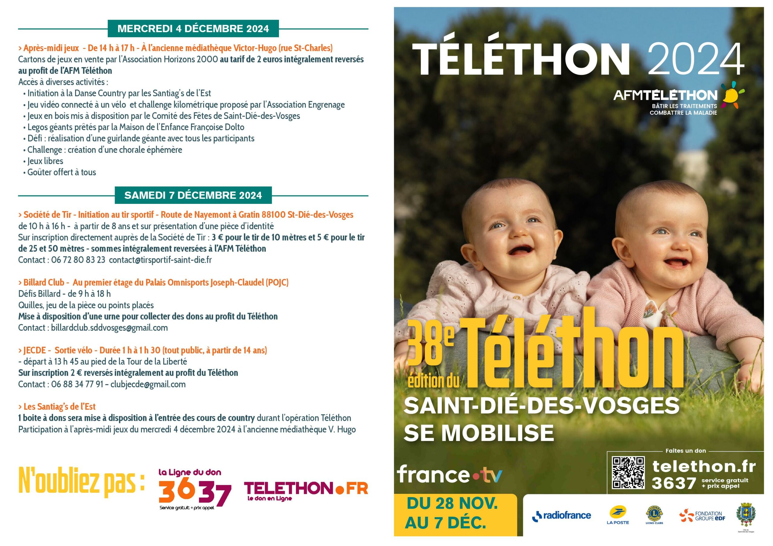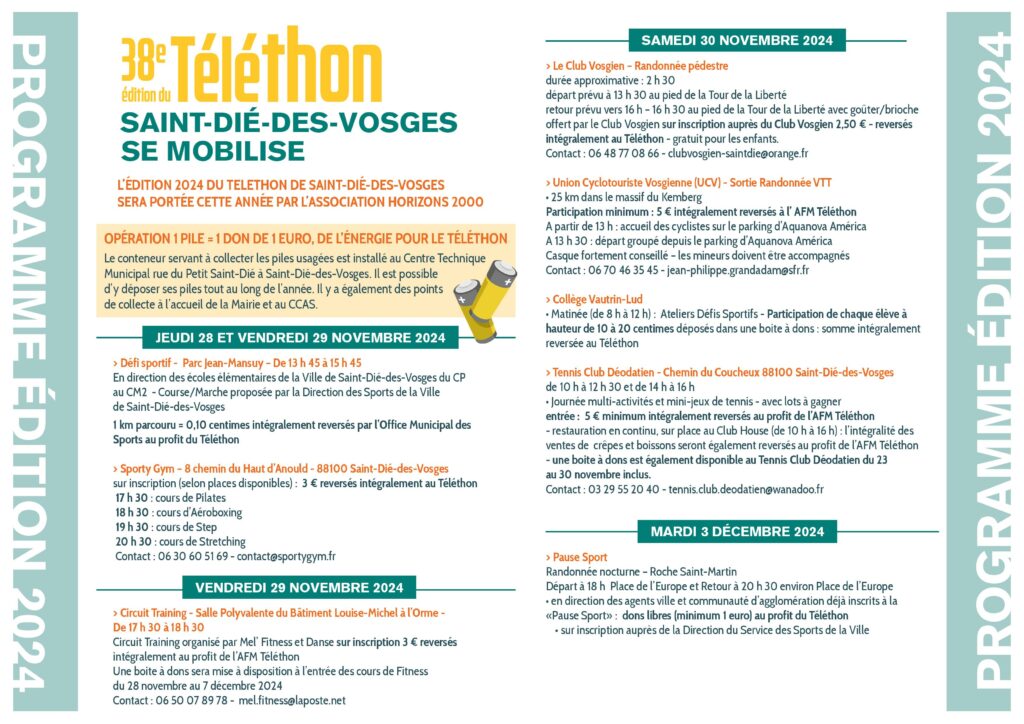 A l’occasion de la 38e édition de cet événement caritatif annuel porté par l’Association Française contre les Myopathies – AFM – Horizons 2000, l’association de gestion du Centre Social Germaine-Tillion et qui porte le Téléthon déodatien cette année, de nombreuses activités sportives, un après-midi jeux, une collecte de piles et une boîte à don s’enchaîneront de ce jeudi 28 novembre au samedi 7 décembre. Toutes ces initiatives permettront de récolter de l’argent au profit de l’AFM Téléthon.